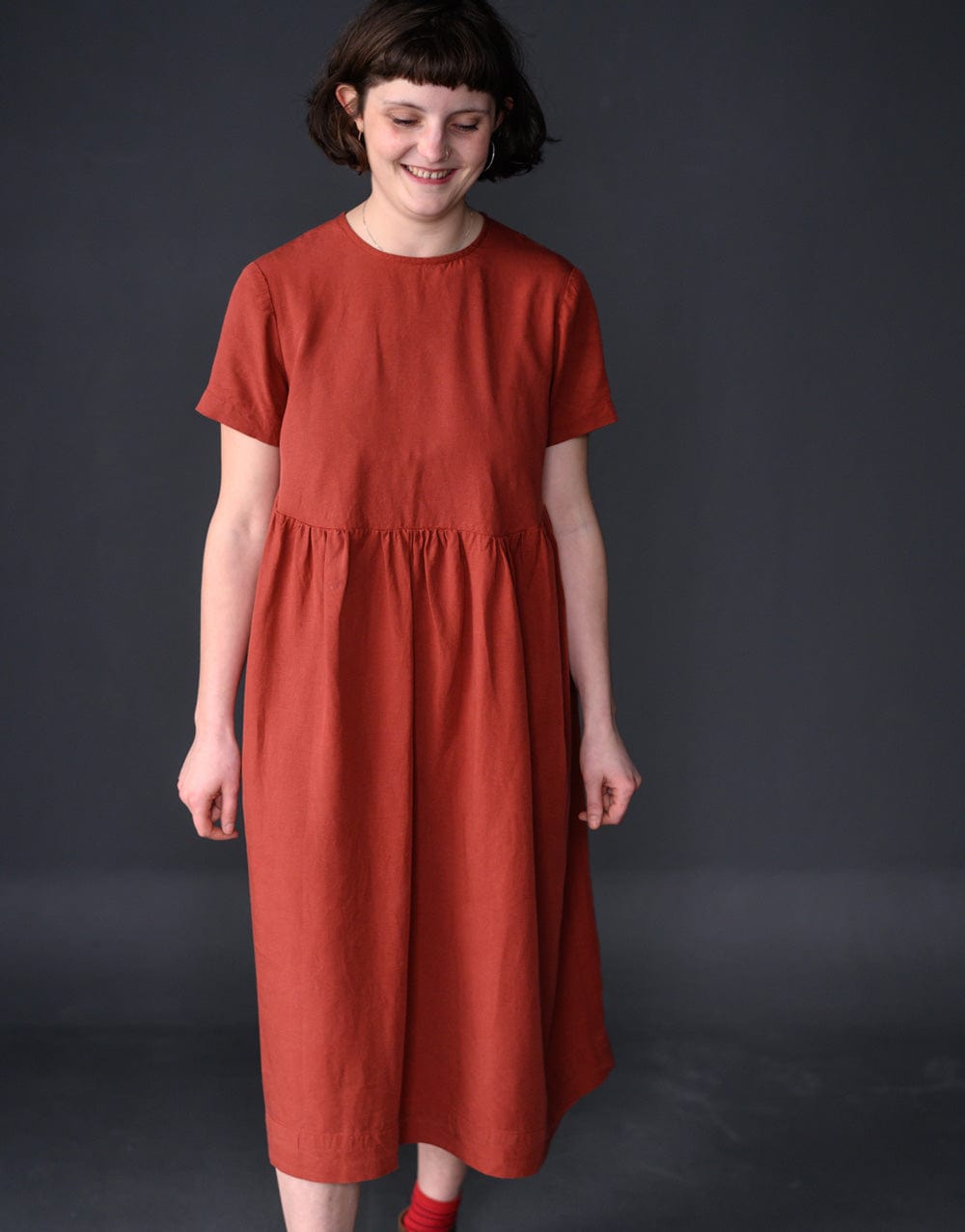 Florence is a sweet swingy top and dress with a button back detail and soft high low gathers.
