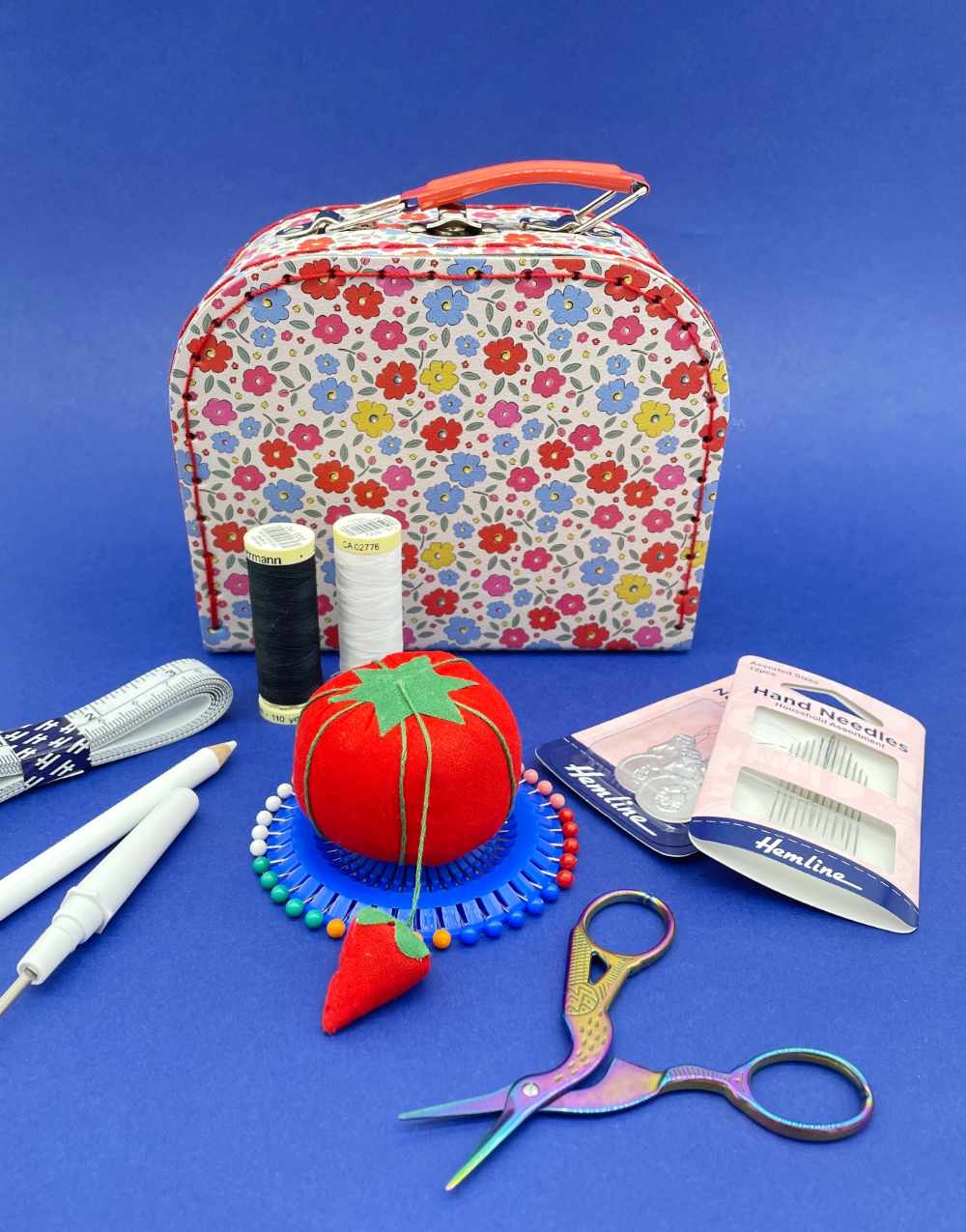 A lovely simple sewing kit beautifully presented in a flowery cardboard suitcase. This is a great kit for anyone starting their sewing journey.