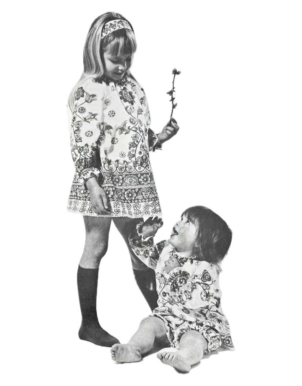 This light and airy summer dress hangs prettily from a gathered neckline and includes matching frilly pants and a hairband. Known fondly as Clothkit Number 7, this kit was first launched in the summer 1971 catalogue and is one of the very early Clothkits. Read more