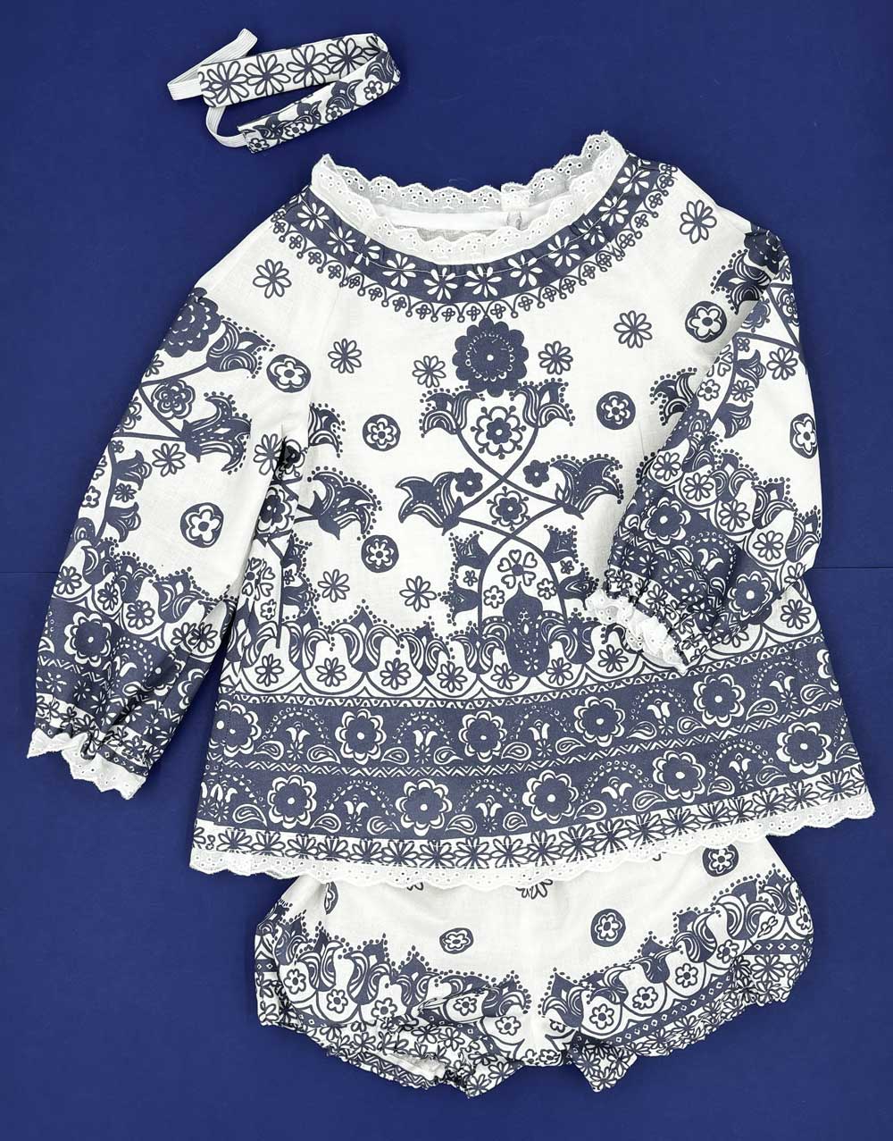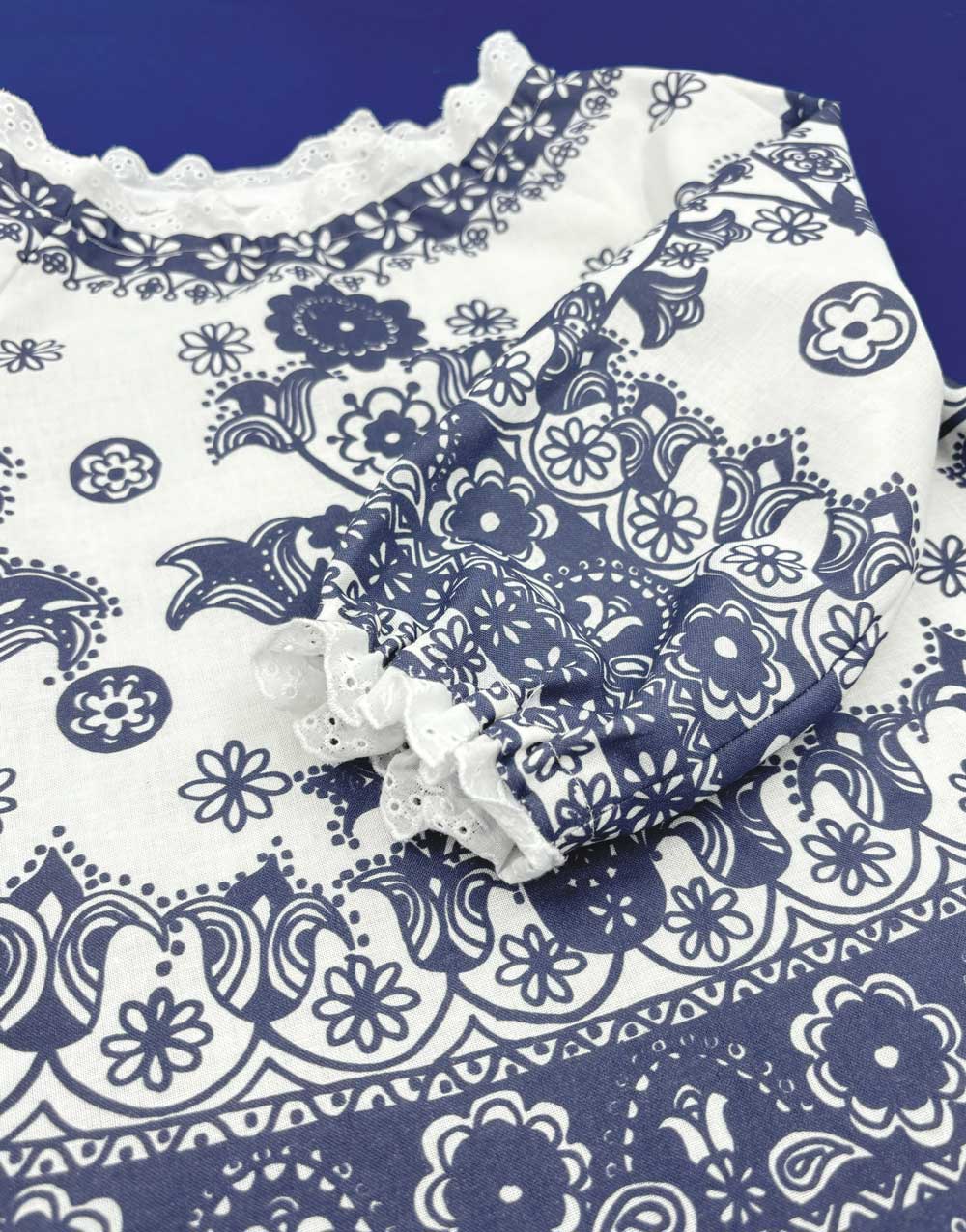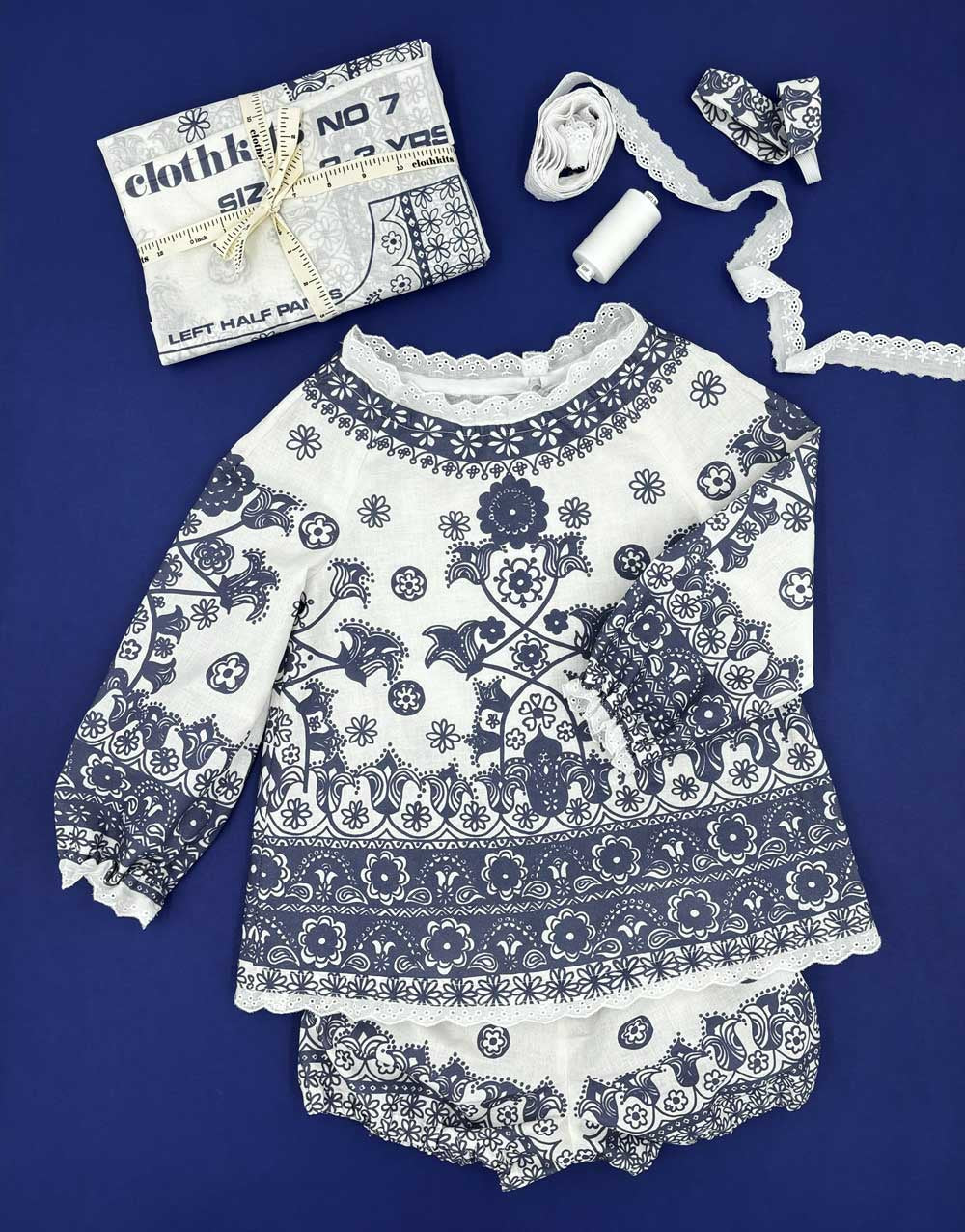 Printed on a light cotton lawn with a dark navy print this set is ideal for balmy summer days. It is designed to fit a child aged 2-3 years.