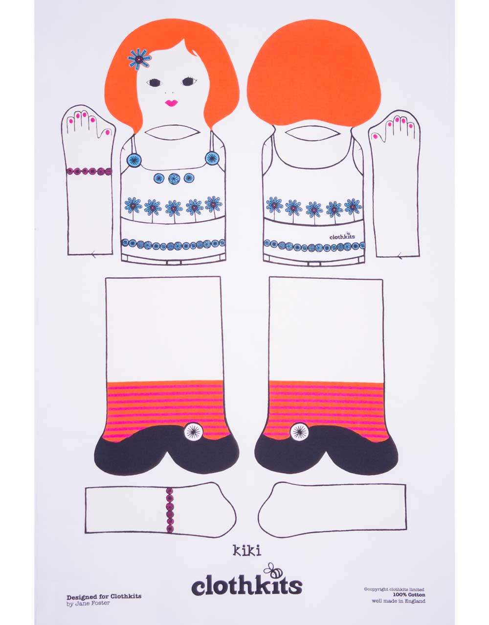 Kiki makes a really special gift and is a great sewing project though adult help may be required as some bits are fiddly. She comes with a Clothkits Poppy dress for you to make too, choose from either green on pink.