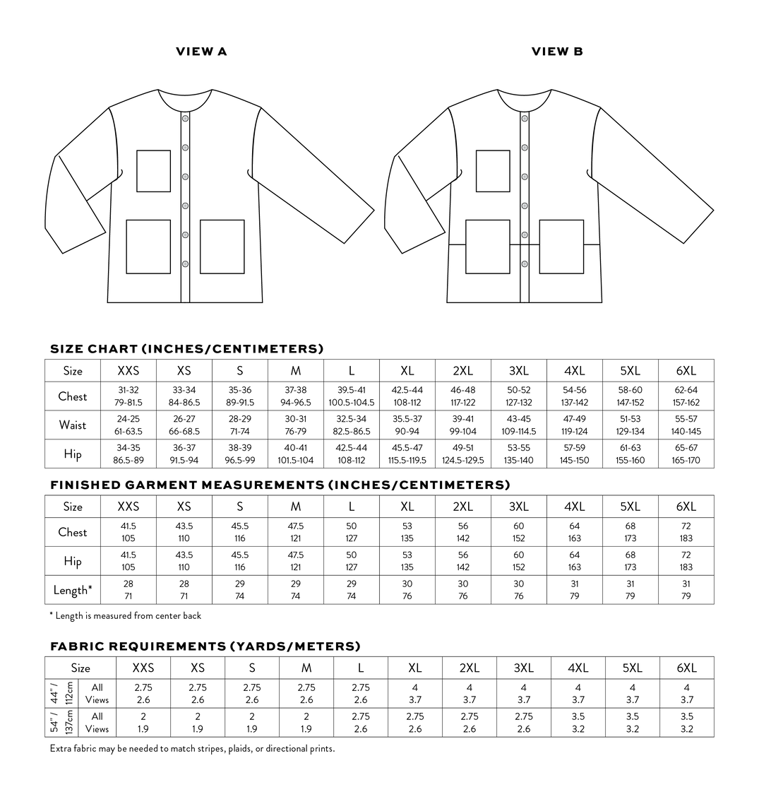 Fabric Requirements: Please refer to the FIND YOUR SIZE tab for the exact fabric requirements and sizing.
