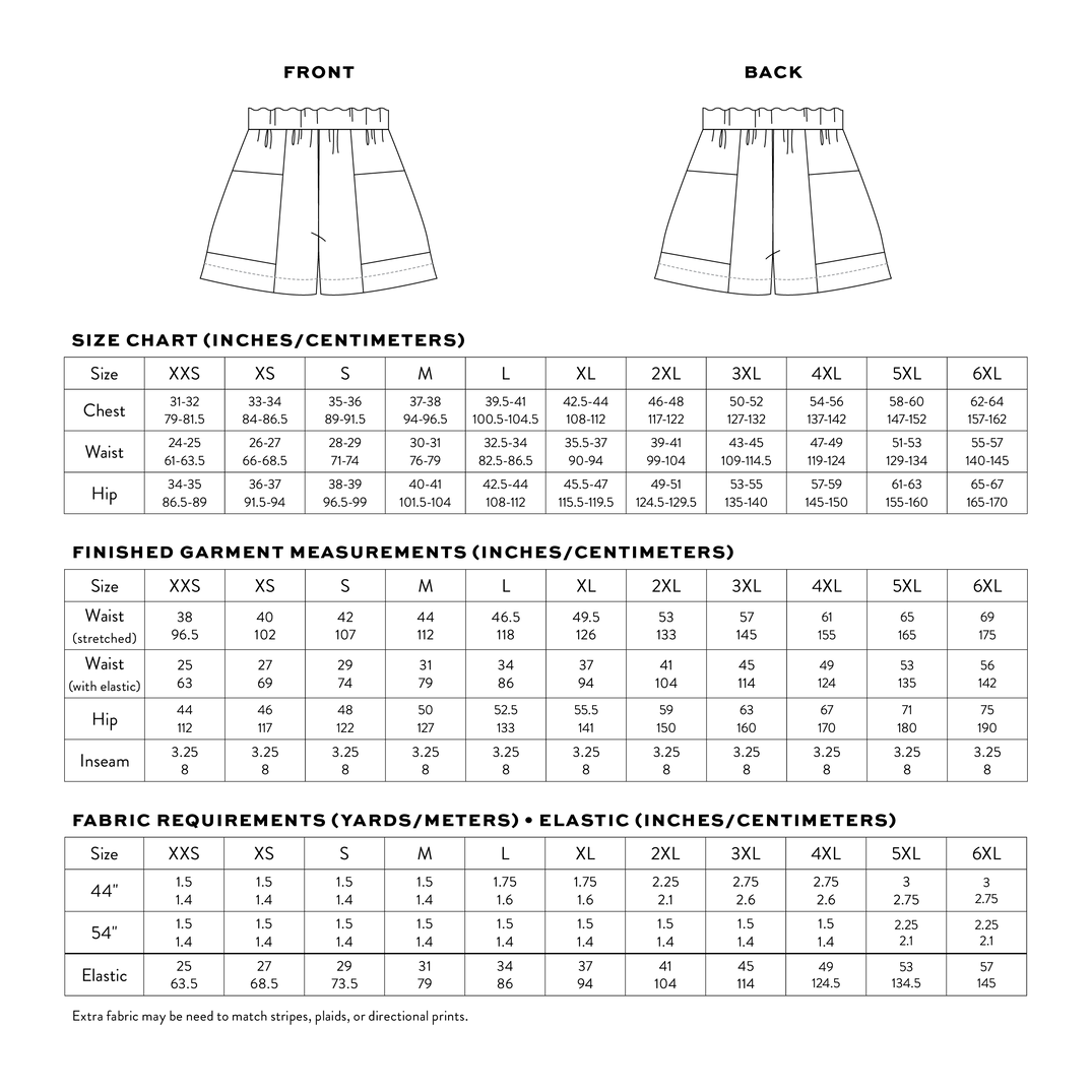 The Weekend Chore shorts are a loose fitting, stylized utility short with fun pocket details. They feature a high rise gathered elastic waist, a 3 1/4" inseam and roomy apron style front and back pockets that match at the side seams, big enough to comfortably contain all your everyday items and more. Designed to look great in a single fabric or patchwork style.