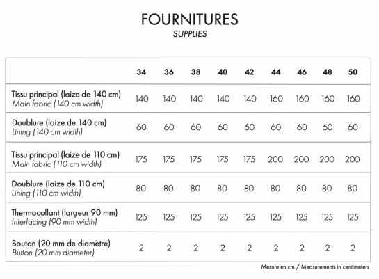 | Main fabric (140 cm width) | 140 | 140 | 140 | 140 | 140 | 160 | 160 | 160 | 160 |