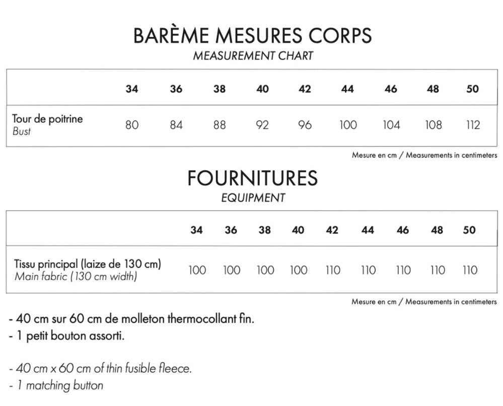 | Main fabric (130 cm width) | 100 | 100 | 100 | 100 | 110 | 110 | 110 | 110 | 110 |