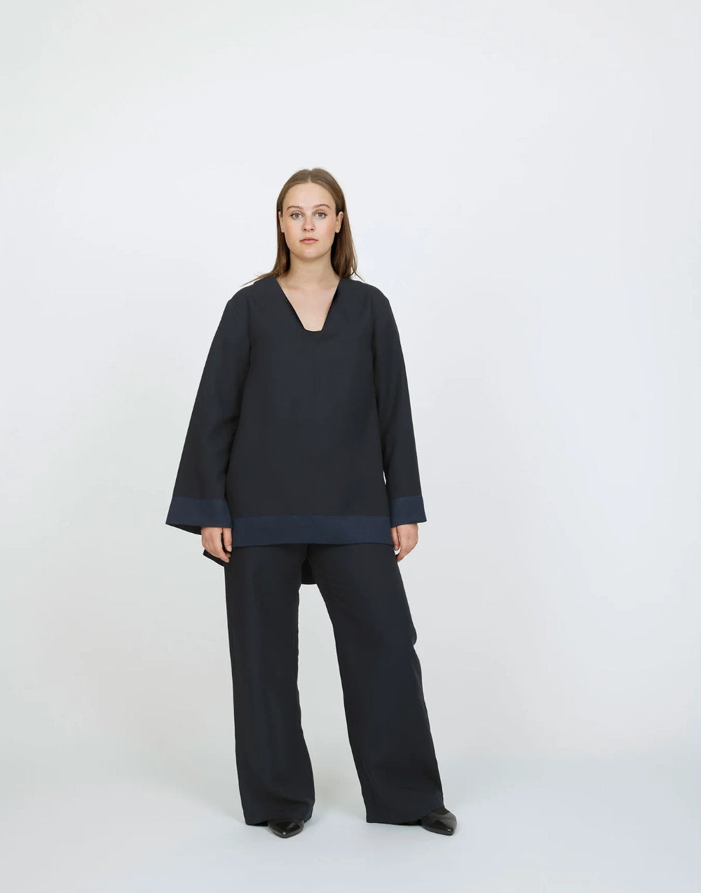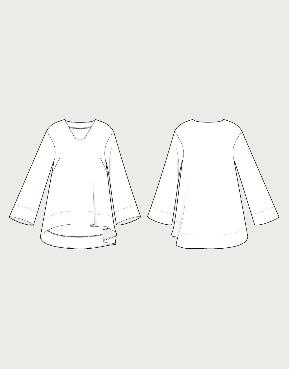 The A-line tunic features a V-shaped neckline with a square-cut bottom. Dropped shoulders and the gently flared silhouette create a relaxed yet flattering fit. Wide facings finish the hem and sleeve edges, while the dipped back hem adds a flowing, elegant shape.