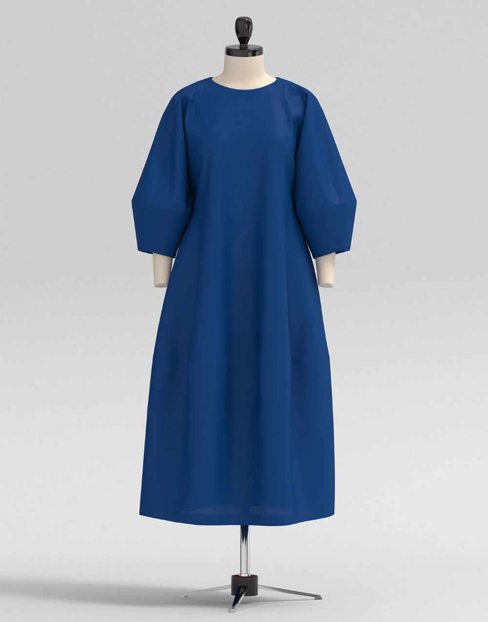 Barrel dress offers ample space and an intriguing silhouette. It comes with a midi skirt with a barrel-like shape and can be sewn with sculpted sleeves that complement the skirt's form, or it can be sleeveless.