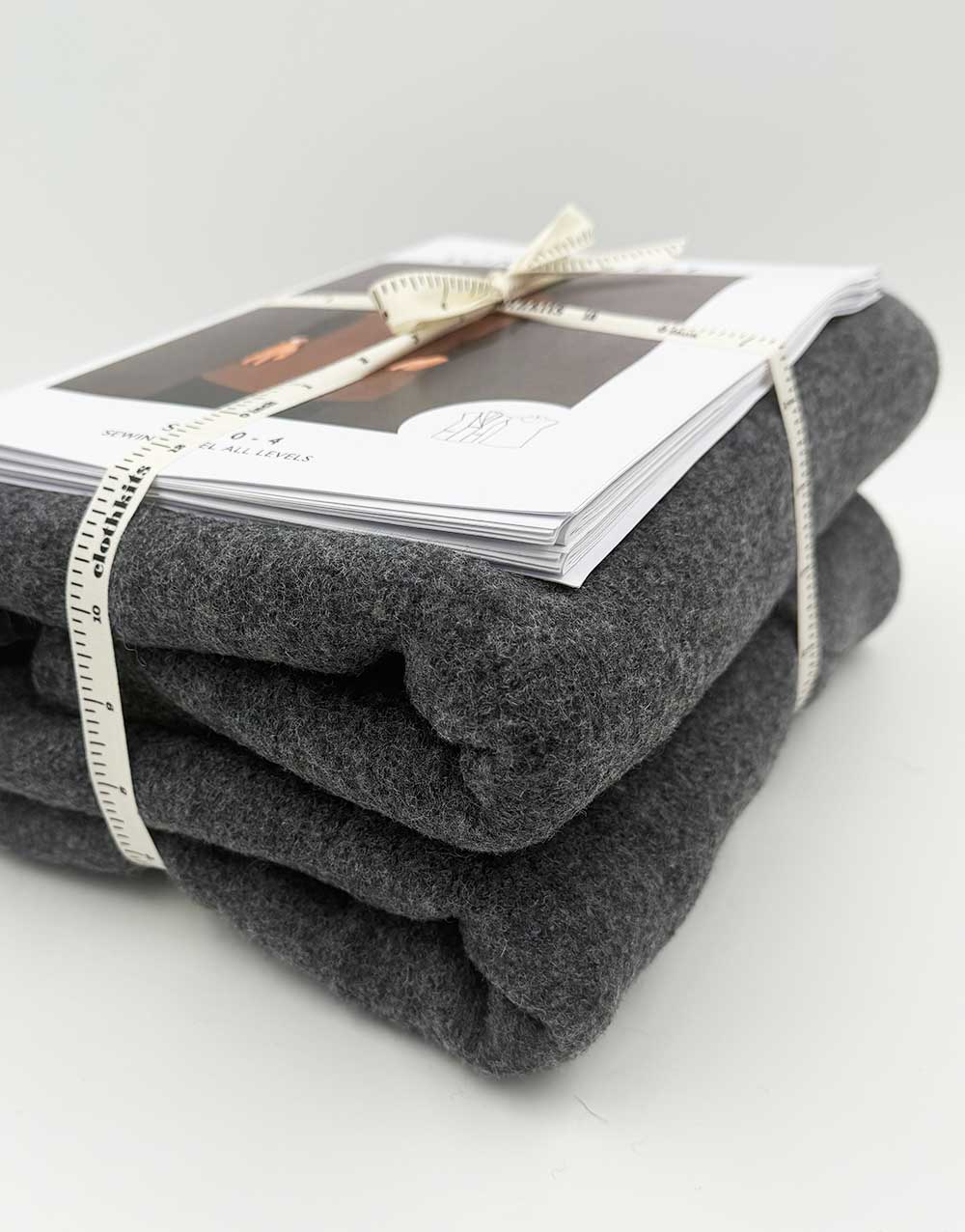Made using premium boiled wool, this project is as enjoyable to sew as it is to wear. The overlapped seams and raw edges mean there’s no hemming required, making it both quick and satisfying to construct. The fabric’s soft structure and natural warmth give the finished garment a cosy yet polished look, perfect for confident beginners or those ready to take the next step in their sewing journey.