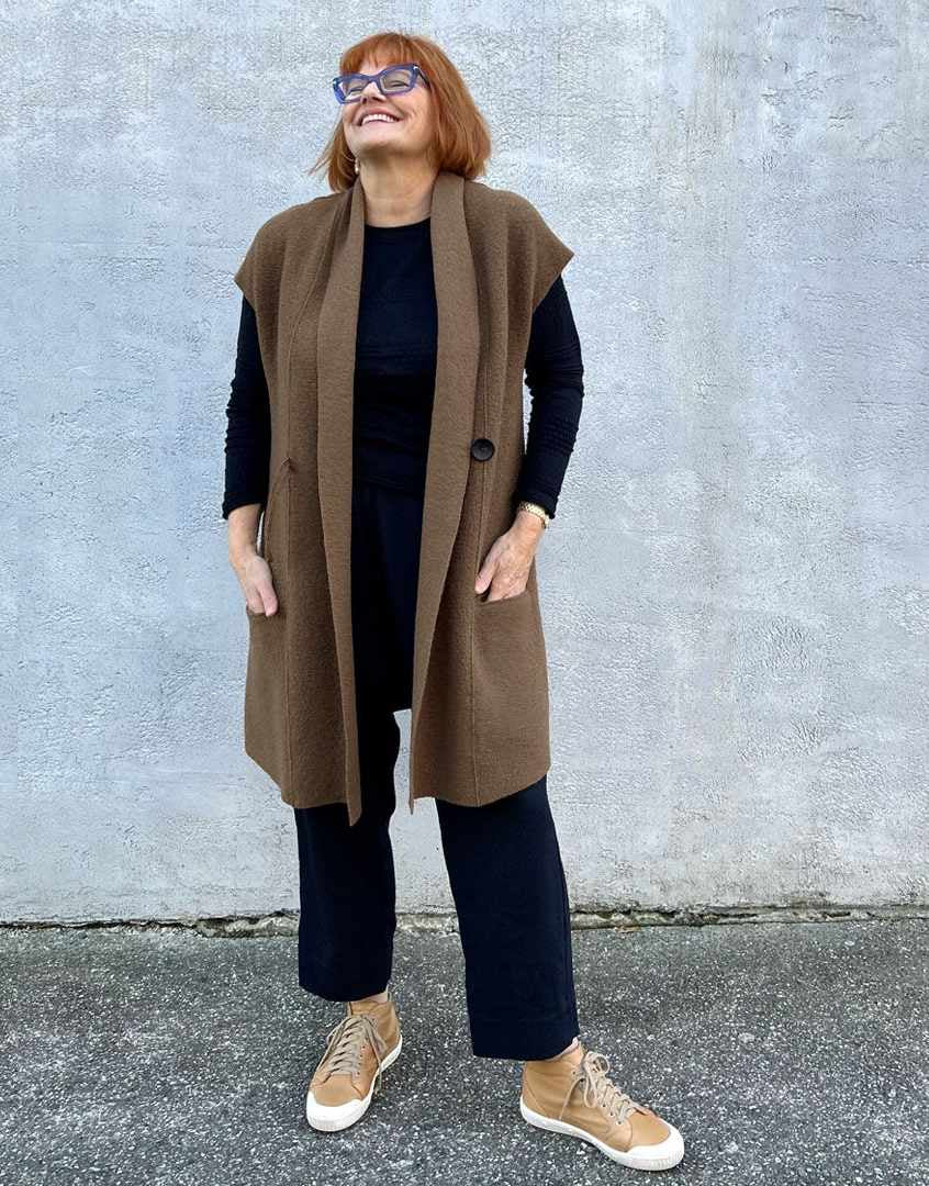 The Torino Vest Dressmaking Kit contains everything you need to create a beautifully tailored sleeveless layering piece with effortless style and comfort. Featuring a relaxed, slightly A-line silhouette, this versatile vest is designed with a cosy shawl collar, extended shoulders, and concealed hip pockets for a flattering and functional finish. The wide collar extends to the knee-length hem and can be worn open and draped, folded back to form a lapel, or wrapped and secured with a feature button and loop. A timeless wardrobe staple to throw over dresses, knits, or shirts through the changing seasons.