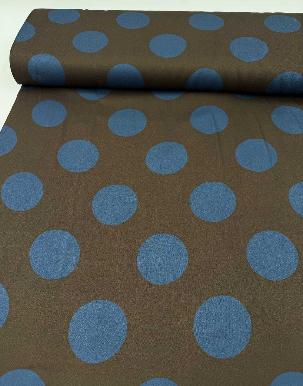 Classic with a playful twist, this bold spot print pairs rich chocolate brown with oversized dark blue circles for a striking retro-inspired look. Its smooth surface and fluid drape make it ideal for statement dresses, chic blouses, or wide-leg trousers that move beautifully with the body.