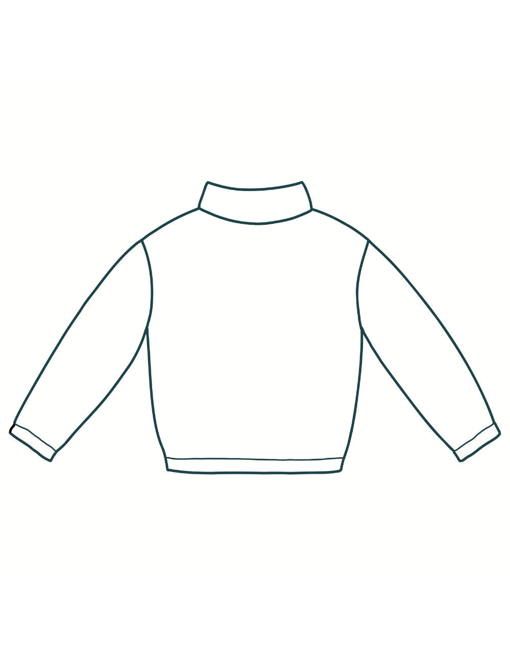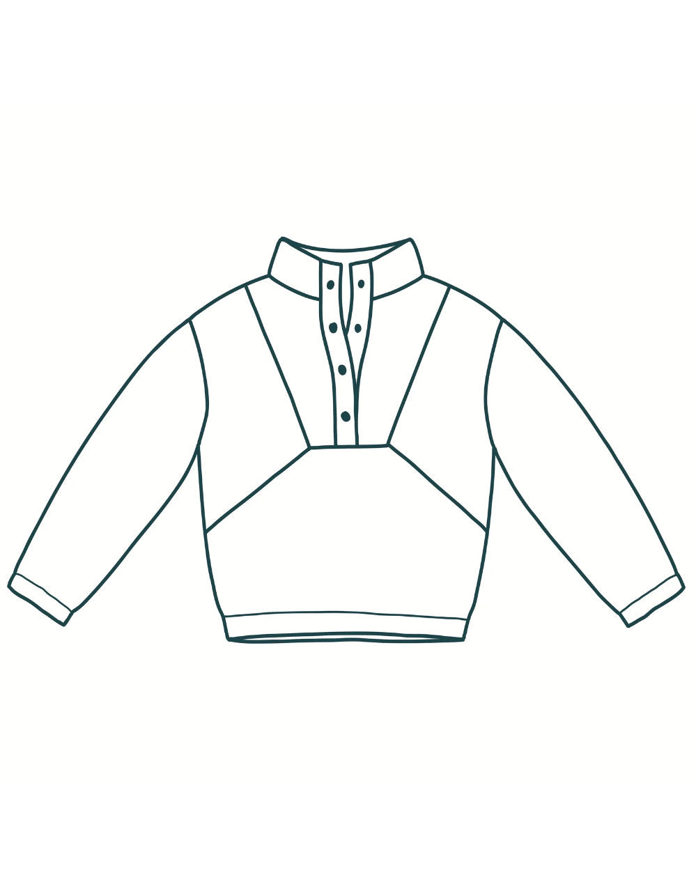 The pockets are cleverly built into the horizontal seam, and the silhouette features slightly dropped shoulders, long sleeves, and a stand-up collar. A contrasting button placket with snaps adds an extra pop of detail, while the elasticated hems at the sleeves and waist give Julia a snug, finished look.