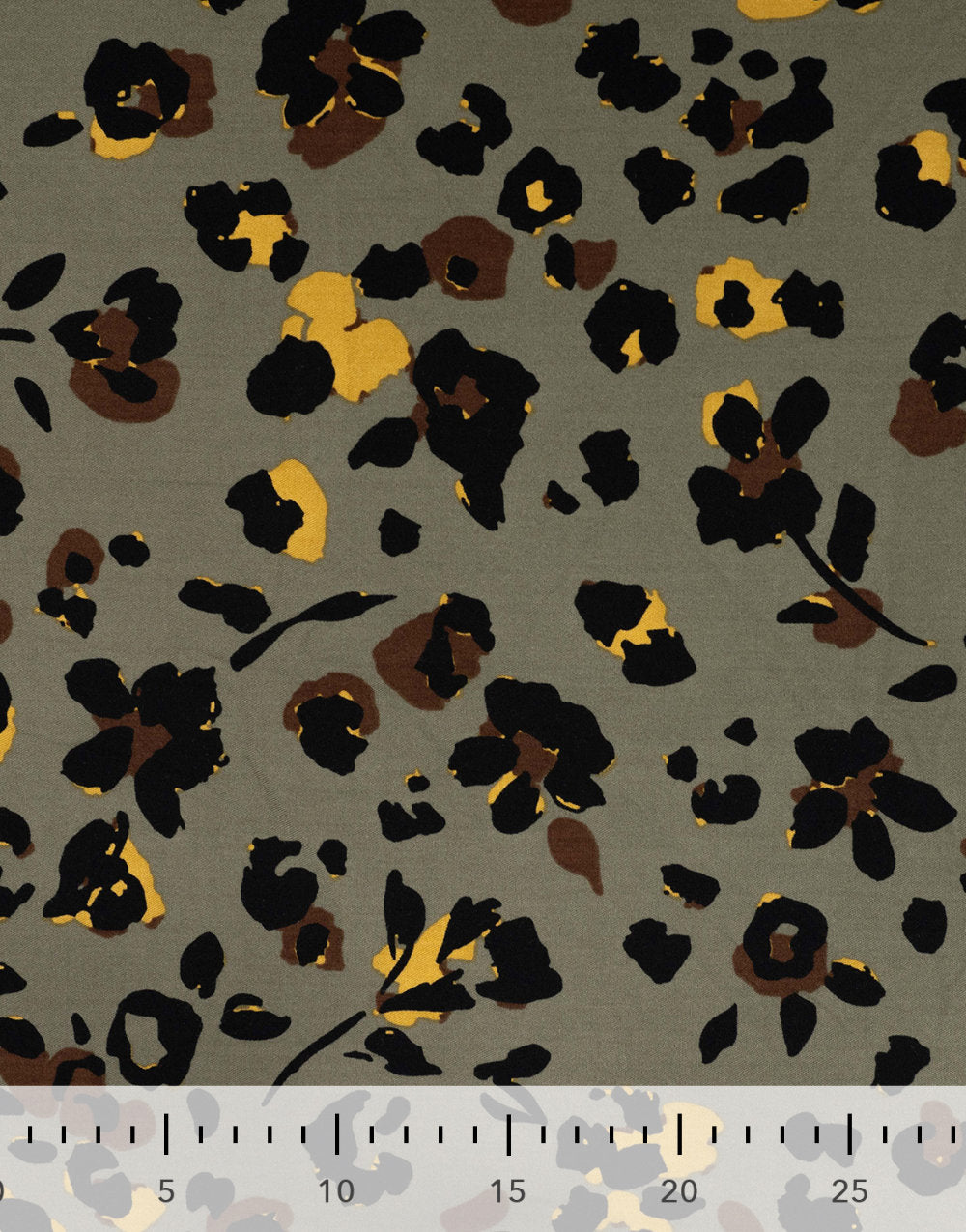 Wild yet refined, Khaki Bloom Leopard Twill reimagines classic animal print with a floral twist. Bold leopard-inspired spots mingle with soft, petal-like shapes in black, chestnut, and golden yellow, scattered across a versatile khaki ground.