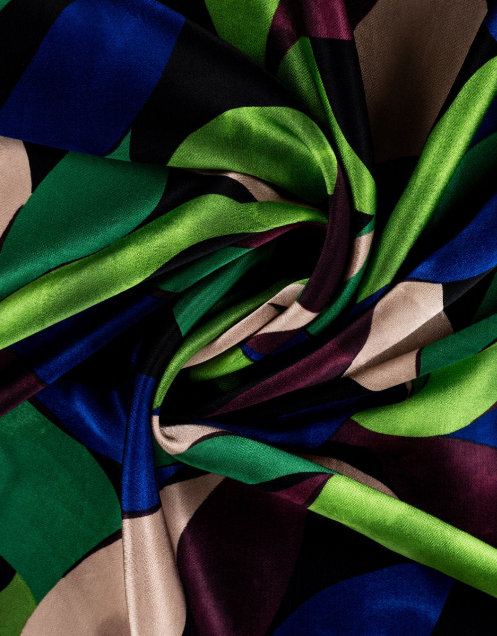 An elegant swirl of jewel tones brings this rayon satin to life, with bold leaves in emerald, sapphire, wine, and taupe layered across a deep black ground. The smooth satin weave gives a lustrous sheen and fluid drape, making it ideal for garments that call for movement and glamour.
