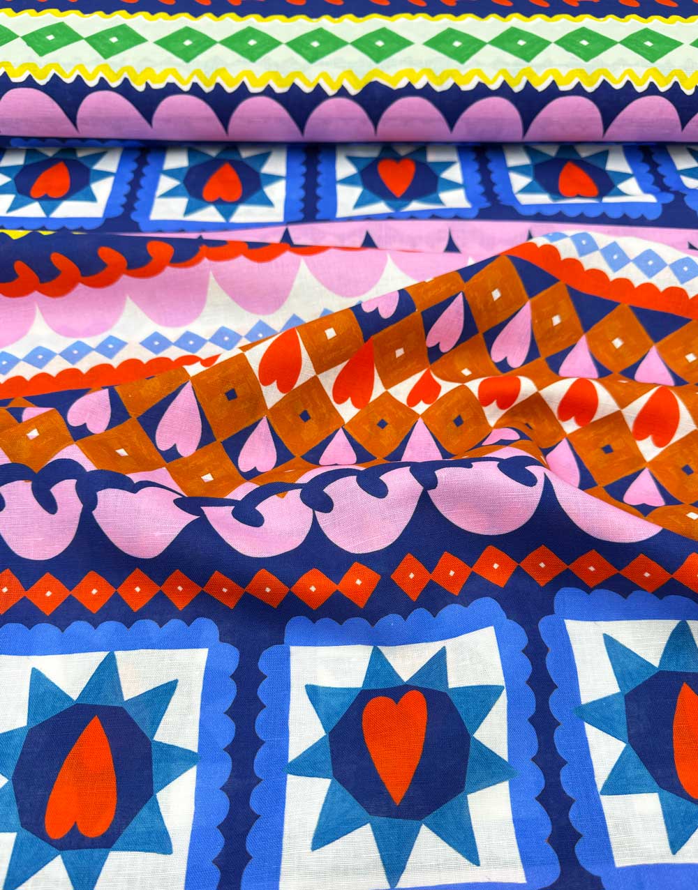 Playful, bold and full of rhythm, this cotton-linen fabric from Australian indie favourites Doops Designs is a stripe lover’s dream. Rows of hearts, scallops, zigzags, diamonds and framed motifs run in vibrant bands of cobalt, emerald, tangerine, pink and violet, creating a design that feels both folk-inspired and joyfully modern. The repeating stripes make a dramatic impact, especially when used across the width of a garment.