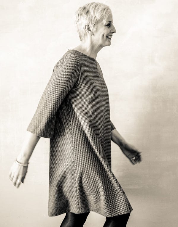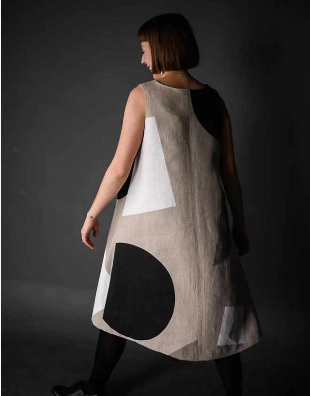 A flared dress, just below the knee, with small neat shoulder and shallow rounded neckline. With the option of a button through back or a simple slip over the head. The trapeze is so easy to make and so easy to wear. Make it for the winter in Harris tweed teamed with a chunky brogue, in a bold block print or a washed linen for the summer. It is endlessly versatile.