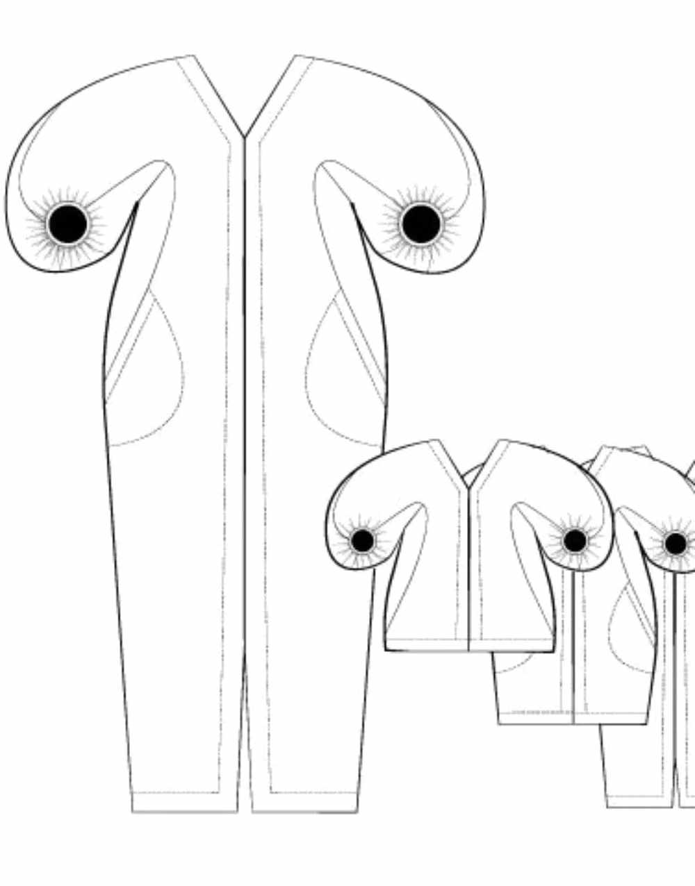 The pattern includes three length variations. Loose through the body and slight taper in the dress length hemlines. The ‘V’ necklines are purposefully cut to be above most bra straps and to minimise shoulder drop. The centre front hem features a mitre corner finish and is split for the two longer length variations. Pocket openings are high on the hip to streamline hips and reduce lapline bagging. There's a lot of ease throughout the body.