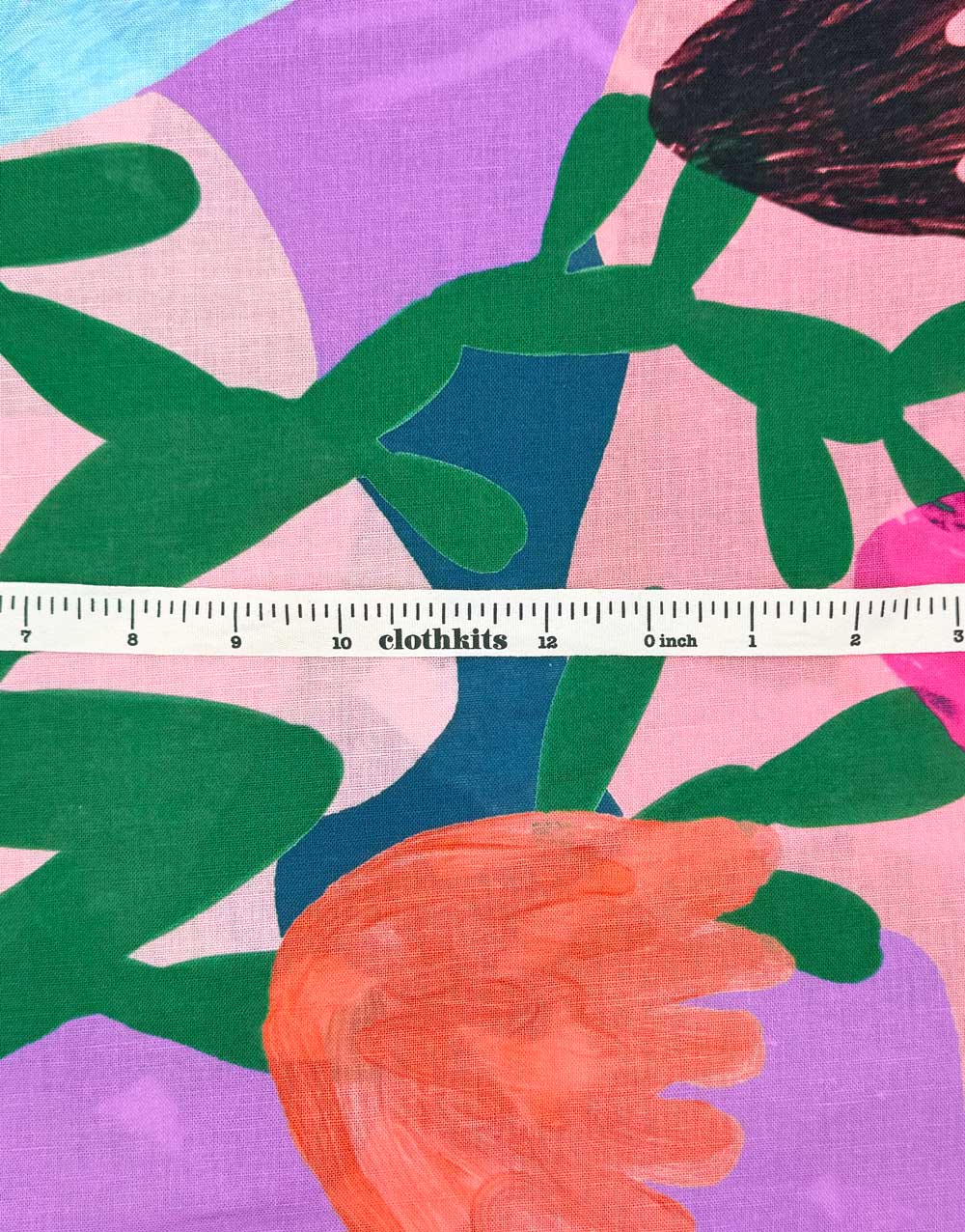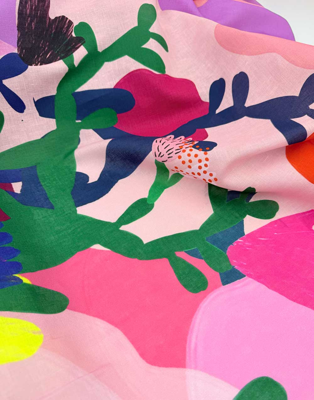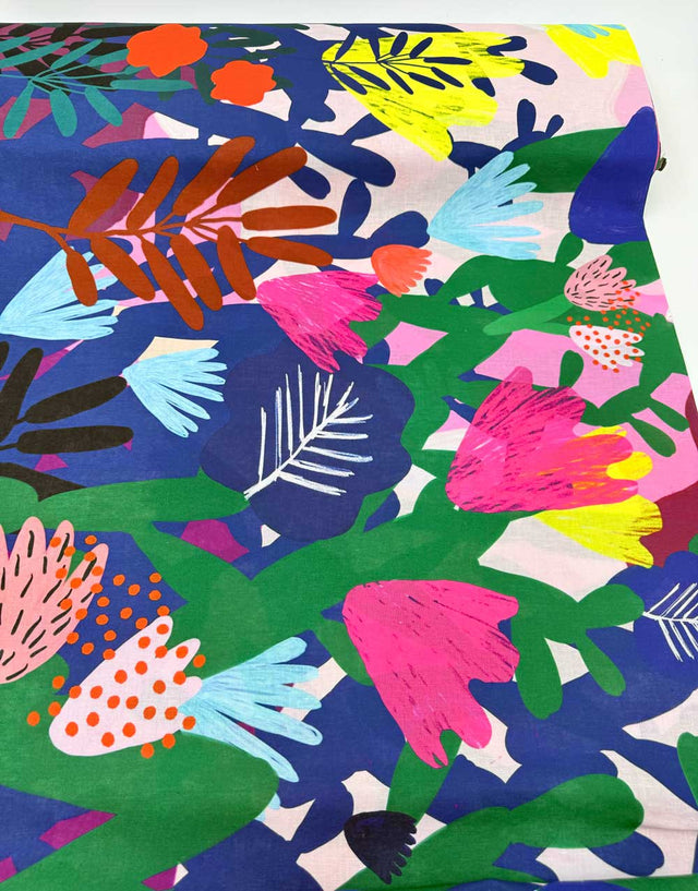 A spectacular statement fabric from Australian indie favourites Doops Designs, this cotton-linen showcases a riot of oversized florals and lush foliage sprawling across the full width of the cloth. Hot pinks, citrus yellows, cobalt blues, emerald greens and fiery oranges bloom against soft blush and lilac backdrops, creating a garden that feels both wild and joyful. The enormous scale makes this design truly stand out - the repeat runs across the full width, repeating every 1.26m, perfect for bold, uninterrupted panels.