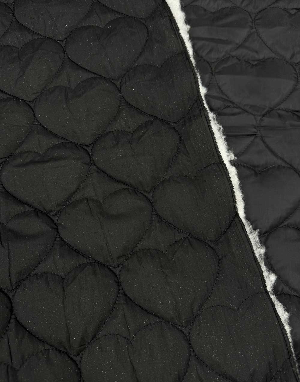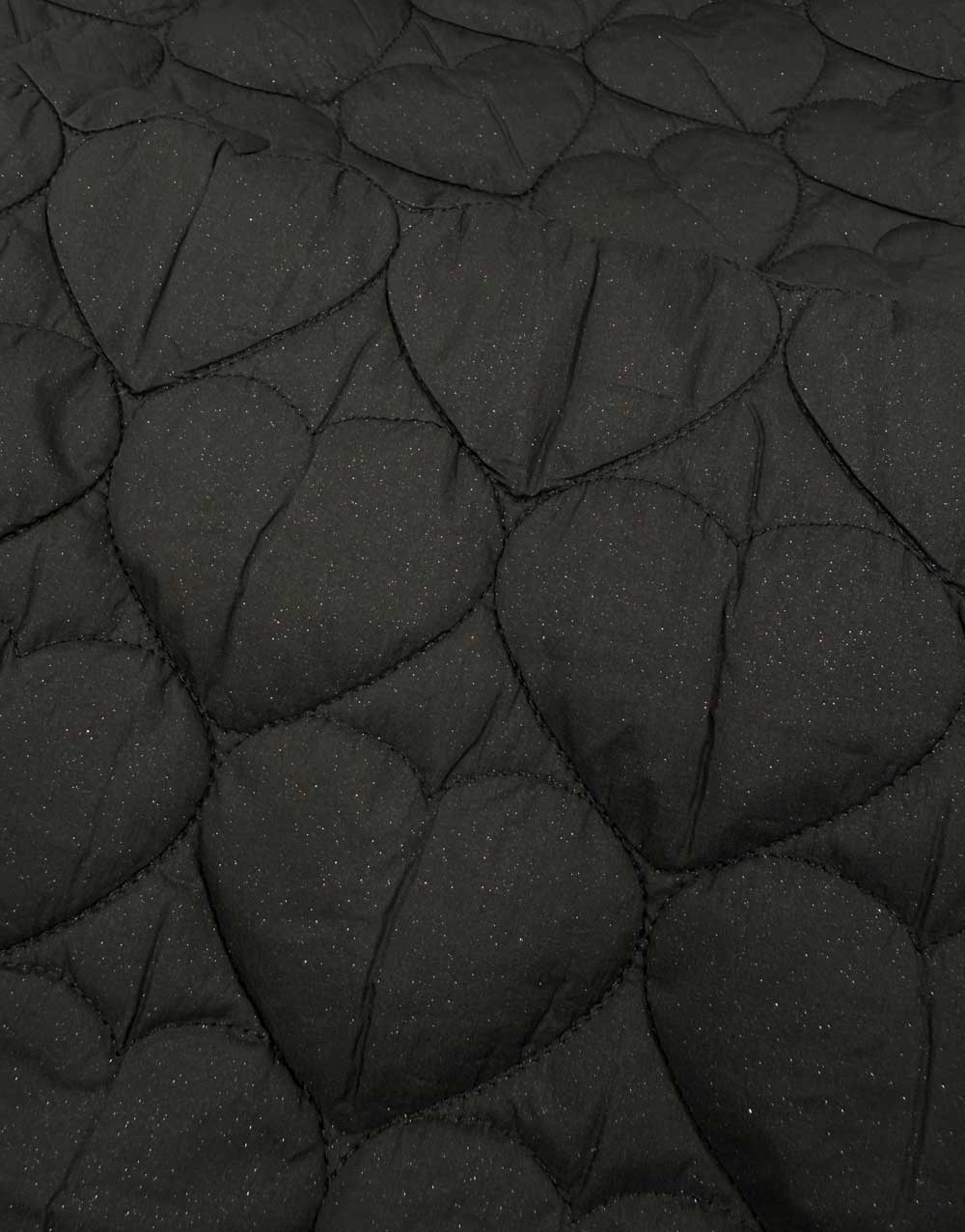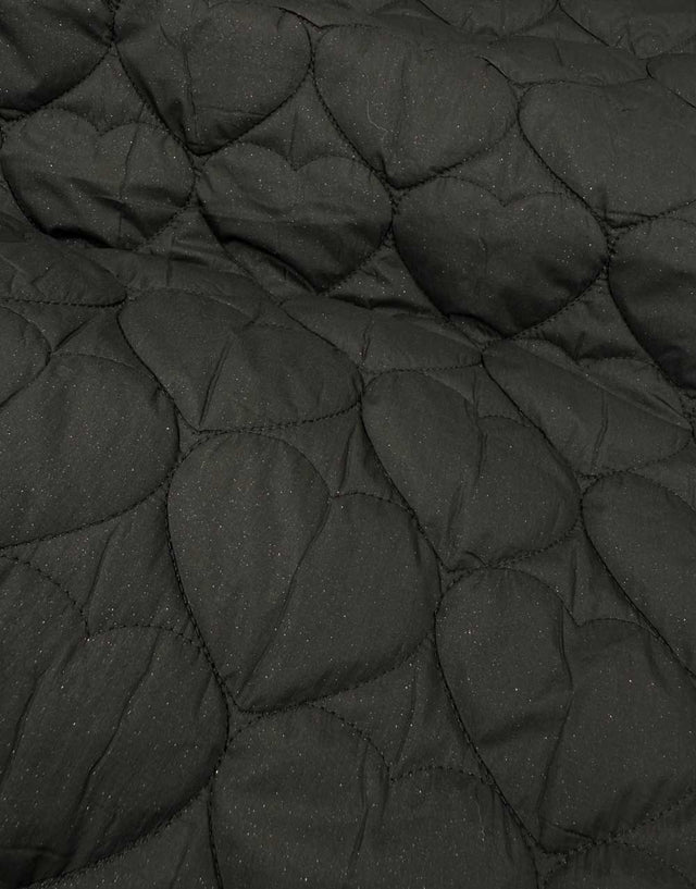 Stardust Quilted Hearts is a soft, quilted fabric stitched into a playful heart pattern. The black surface is scattered with delicate glittery flecks, catching the light for just the right amount of shimmer.