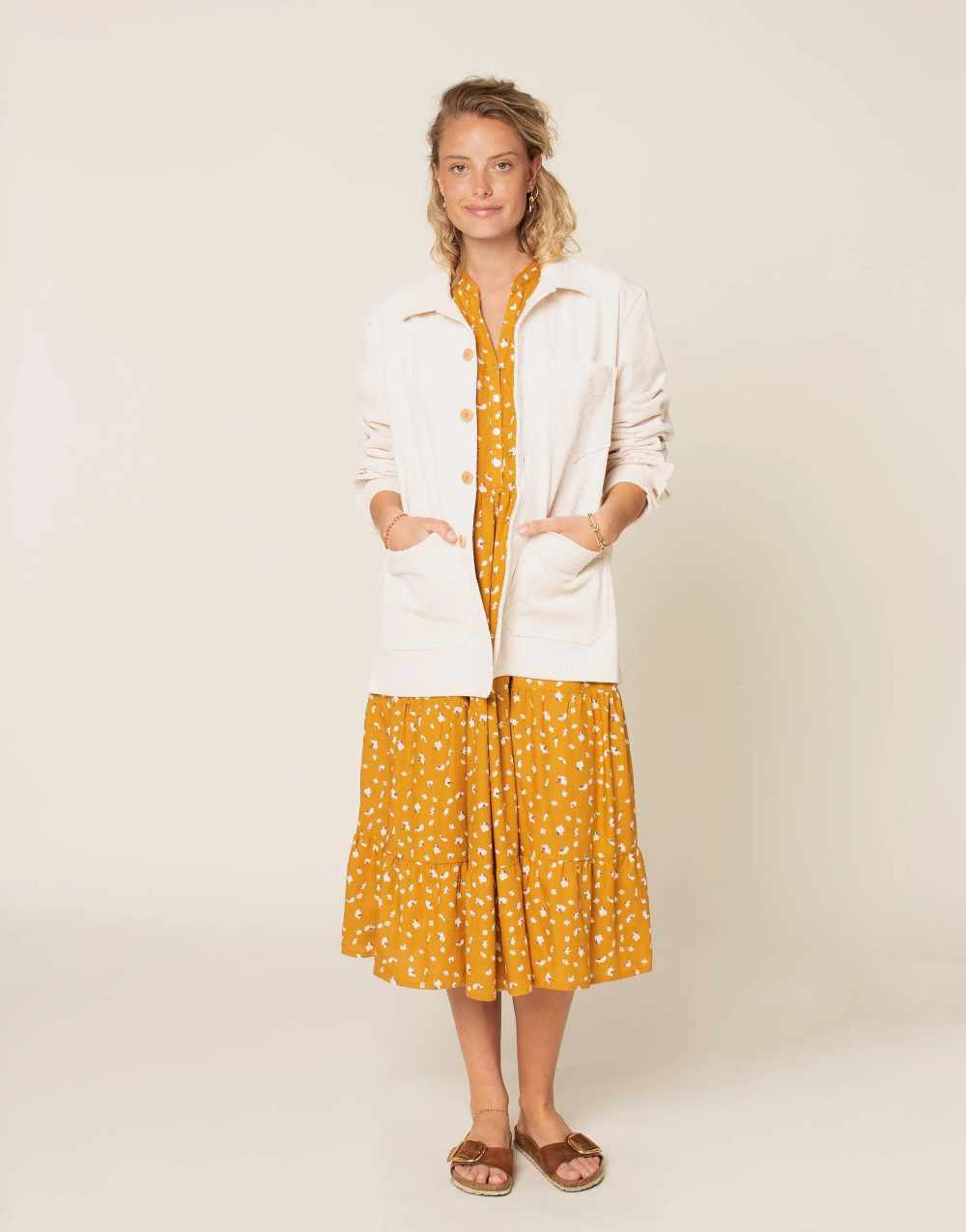 A shirt jacket inspired by workwear or the boxy Lumberjack shirt. The sewing pattern has a convertible collar, interchangeable pockets, and two-piece cuffed sleeves.