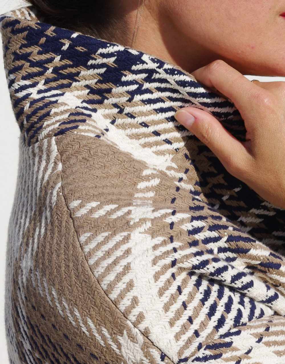 Suggested Fabrics: A supple wool (avoid a heavy pea coat type or stiff woolens), jacquard, tweed, fake fur, weighing around 300 to 550 g / m2 to highlight the shawl collar without hiding the dropped shoulders.