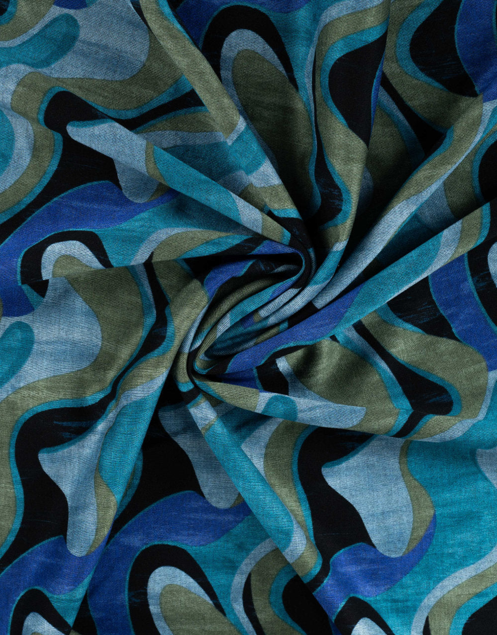 A bold ripple of colour, this Punta knit features undulating waves in petrol, teal, olive, black, and cobalt blue. The print has a retro, almost psychedelic energy, while the fabric itself is soft, stretchy, and comfortable to wear.