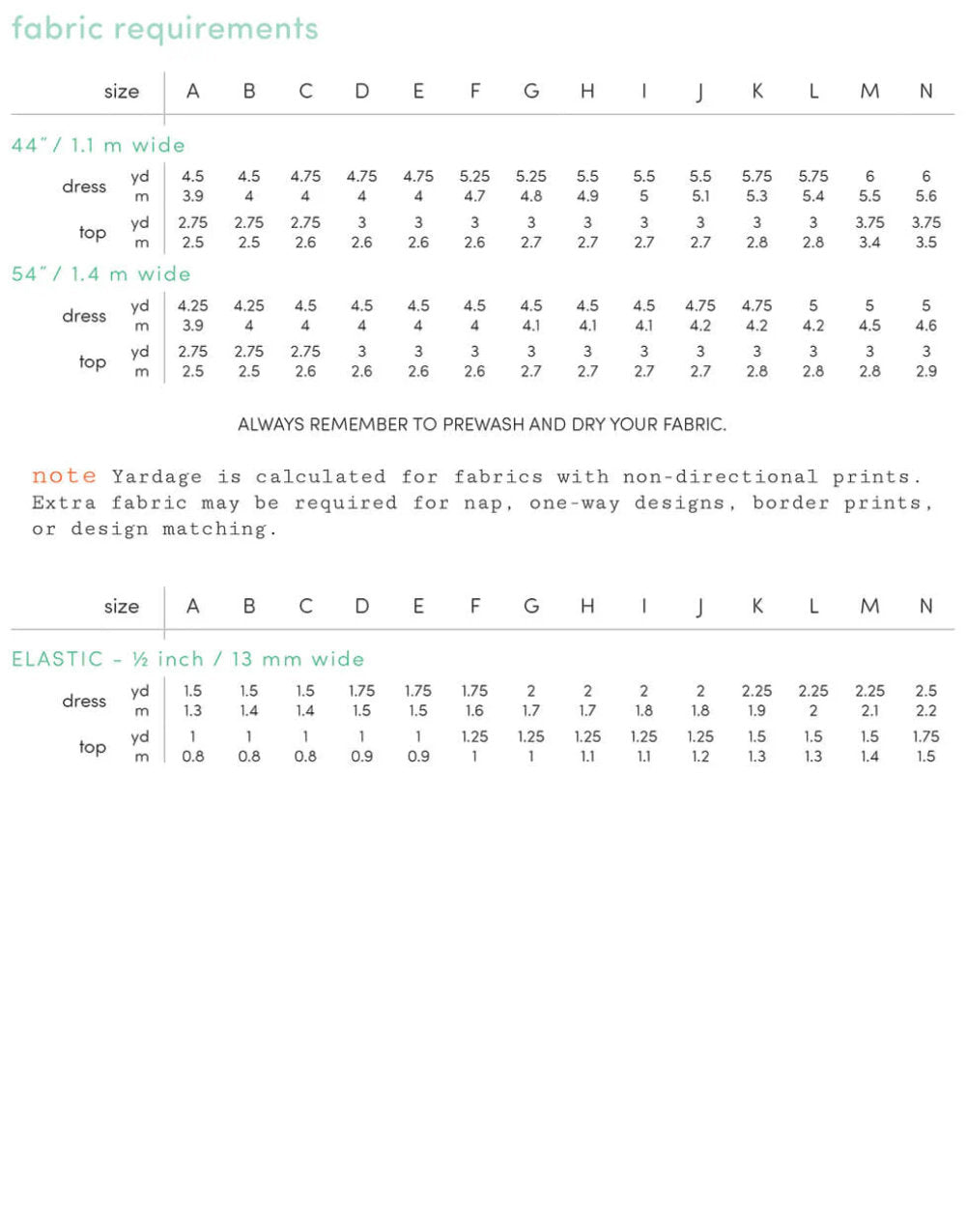 - Elastic for waistband and cuffs (1/2“ [13 mm] wide - 1-2.5 yard [0.8 - 2.2 m] total (see elastic chart for exact amount)