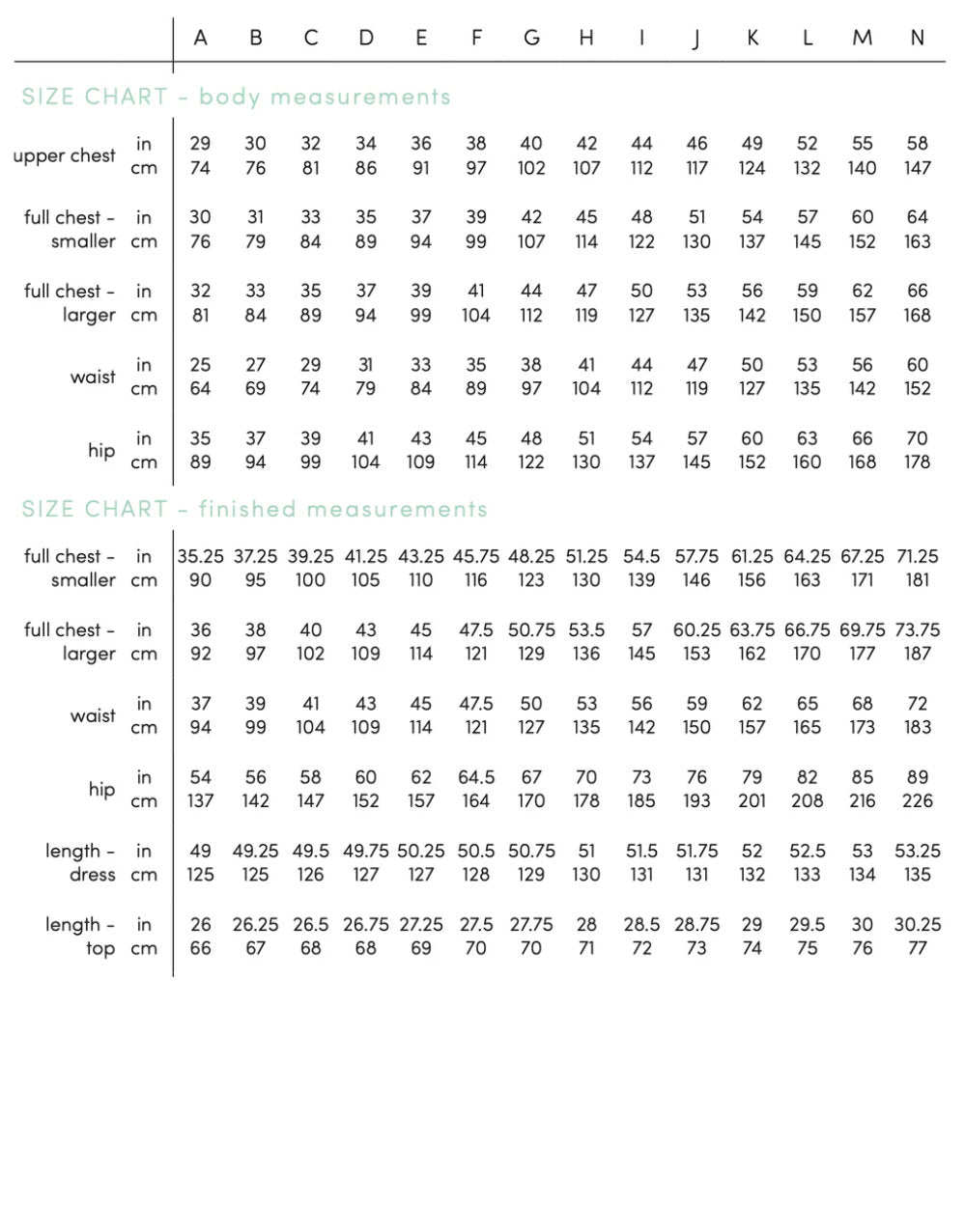 Sizing: fourteen sizes A-N, designed for chests 32-66 inches (81-168 cm)