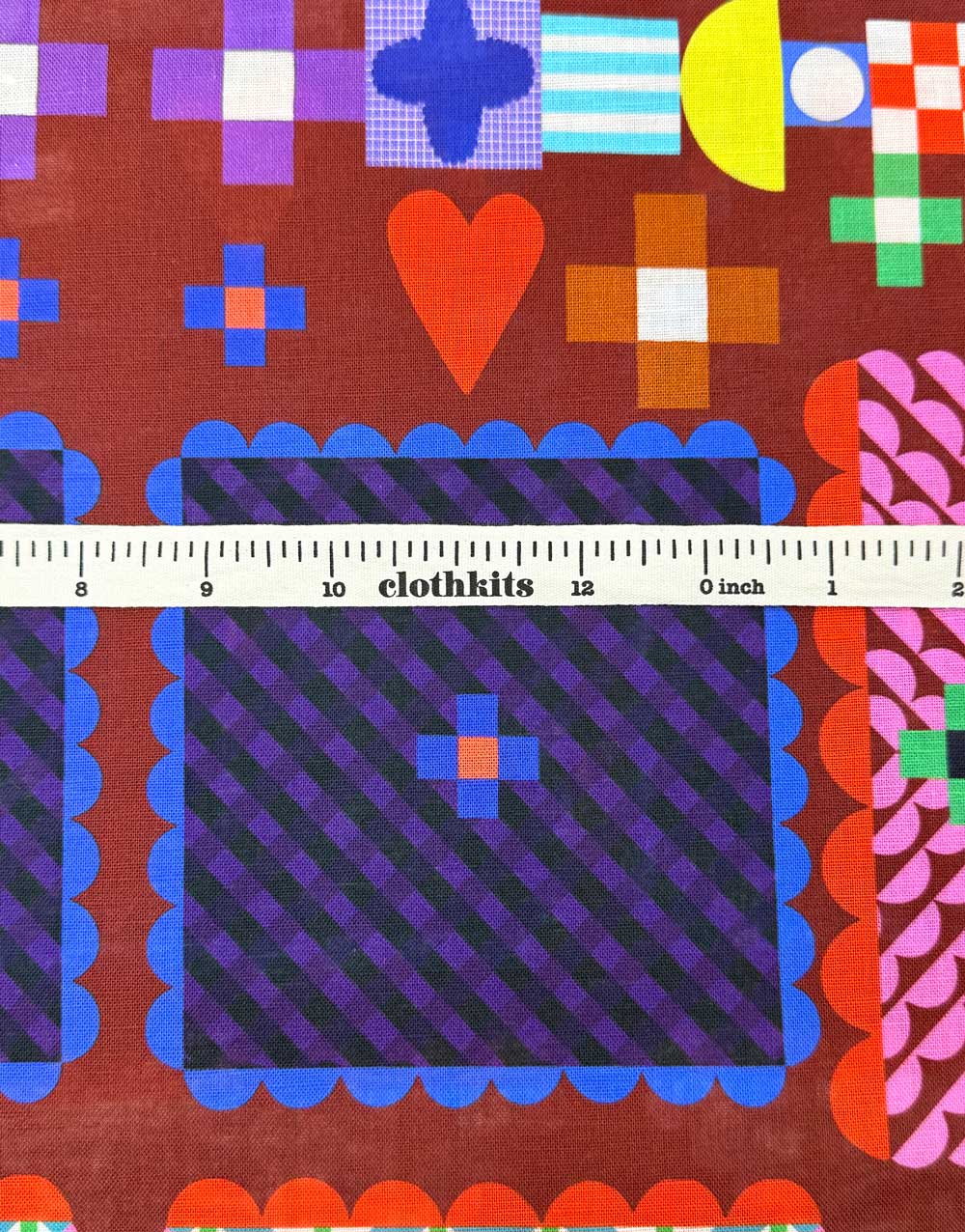 Rich, bold and full of character, this cotton-linen fabric from Australian indie favourites Doops Designs is a patchwork-inspired delight. Graphic squares, triangles, hearts and crosses are arranged in a vibrant grid, with playful scalloped edges and bold colour blocks of emerald, violet, orange, red and cobalt all layered over a deep brick-red ground. The effect is striking, a modern twist on folk-art and Scandinavian design traditions.