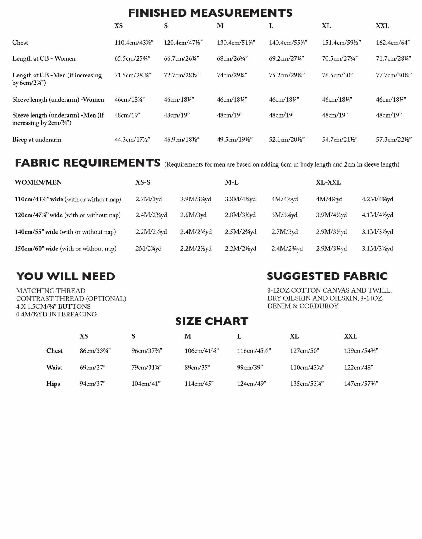 Fabric Suggestions: 8-12oz cotton canvas and twill, dry oilskin and oilskin, 8 -14oz denim and corduroy. A heavier weight cloth will result in a more structured jacket.