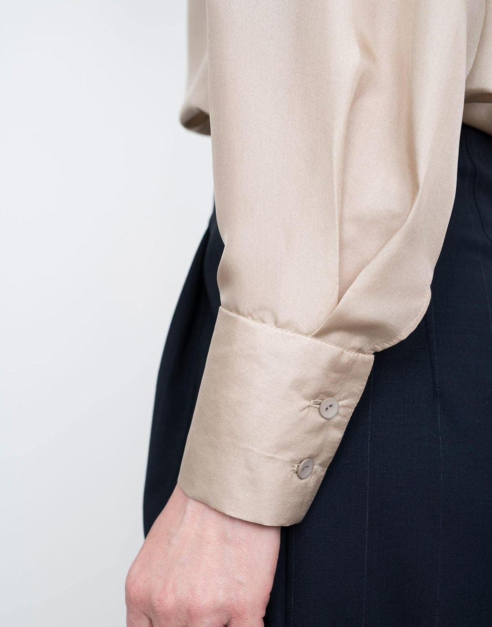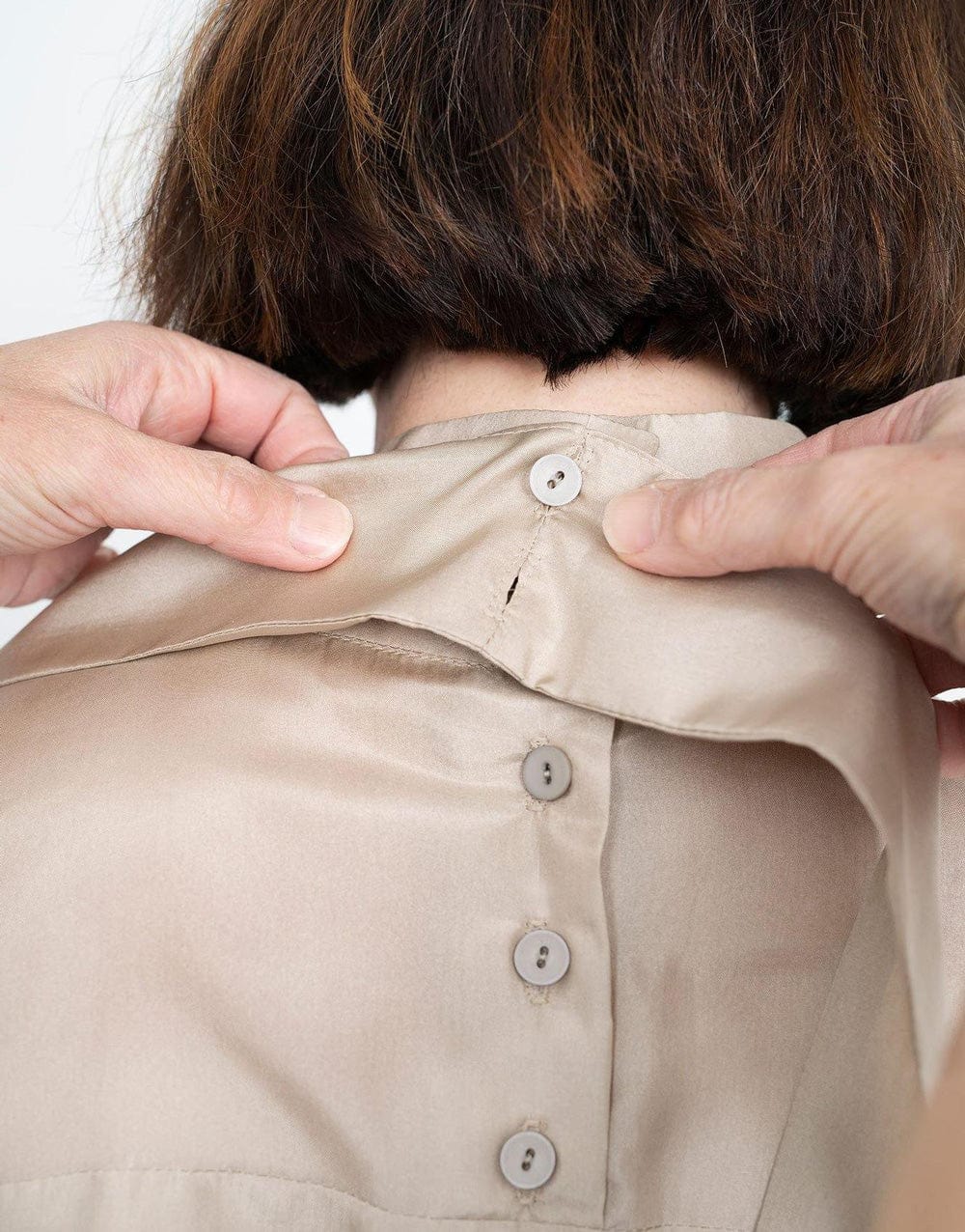 The Tie bow blouse is versatile with a classic shape. It features bust darts and a standing collar where you can attach a tie with buttons to the back. The sleeves end with pleats to create a puff and close with button cuffs.