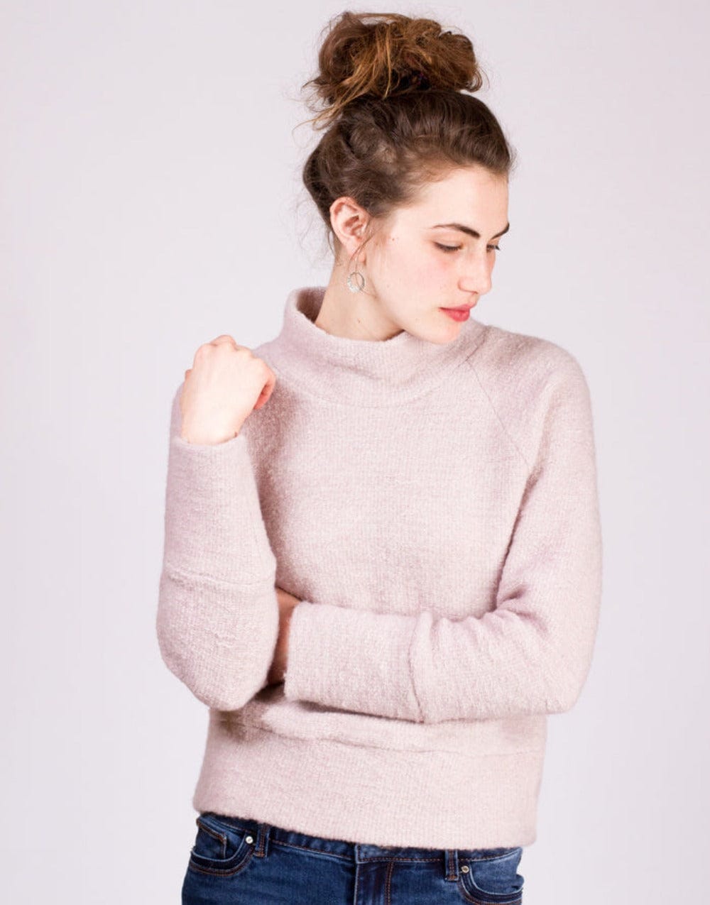 Sweater #1: Is a closer fitting, semi-cropped sweatshirt/sweater. It works best when sewn in thick, stiff knits with some body to keep the neck standing upright. It features raglan sleeves, a wide waistband, a loose turtleneck, long cuffs and falls between the high and low hip. It’s great in a standard sweatshirt fleece (with stretch) however, it’s also extremely handsome in a sweater knit to dress it up a bit.