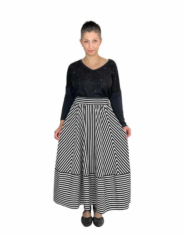 The Ziggy Skirt is perfect for showcasing your favourite stripy fabric! This three-quarter circle skirt is divided into panels to create a striking chevron pattern at four seams - two at the front and two at the back.