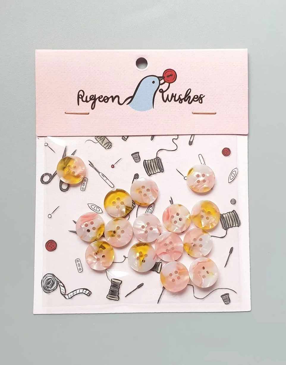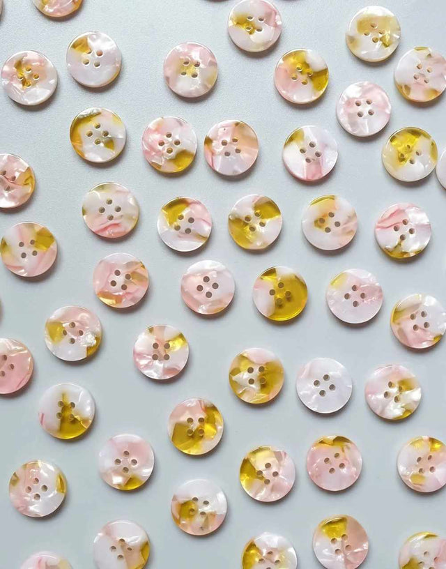 A charming set of 15mm marbled pink and yellow shirt buttons, each one completely unique. Perfect for adding a special touch to your handmade garments or breathing new life into your upcycled pieces.