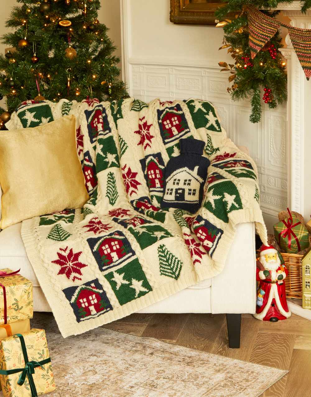 The book includes patterns for blankets, cushions, hot water bottle covers, baubles, stockings, gift sacks, bunting and even a ginger bread doll.