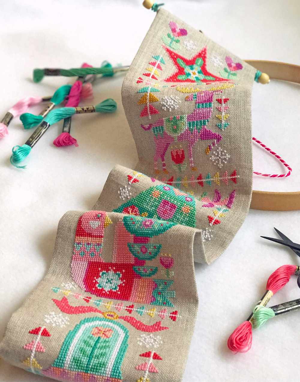 - 12” x 26” (30 x 61 cm) piece of linen. The image shows the sampler stitched on 28 count Raw Natural linen.