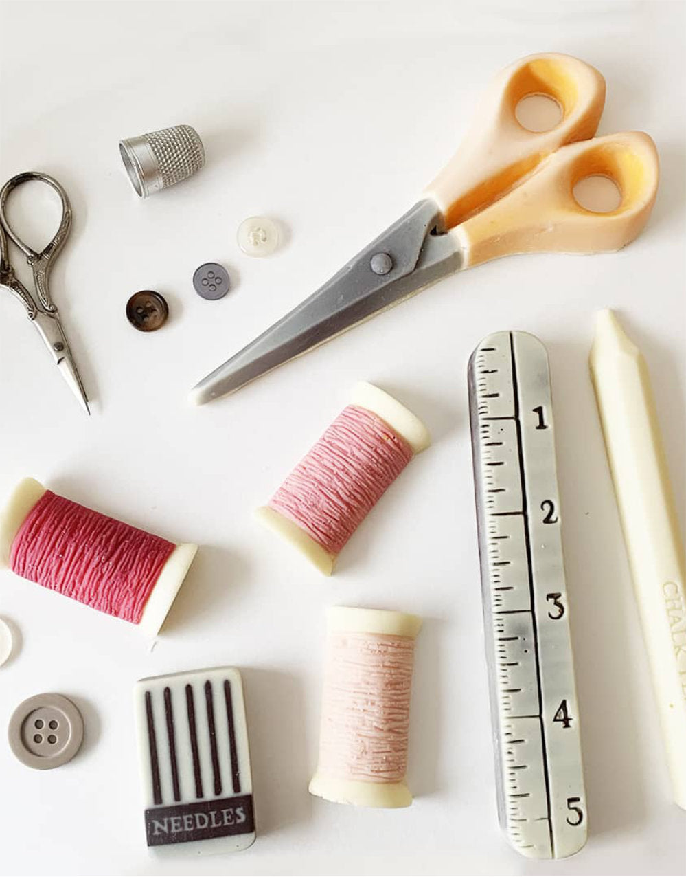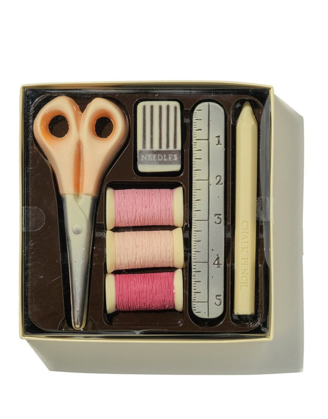 Wow a sewing fan with this fabulous Chocolate Sewing Kit! The chocolate gift contains all of the sewing kit essentials: 3 chocolate cotton reels, chocolate scissors, sewing needles, ruler, and chalk pencil, all handcrafted by our artisan chocolatiers from a blend of the finest Belgian dark and white chocolate.
