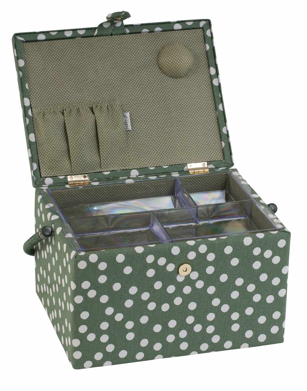 Large sized sewing box covered in 100% cotton fabric with a khakio green and cream spot. There is a hard plastic internal tray with compartments for sewing accessories, an internal pocket and pincushion are inside the lid.