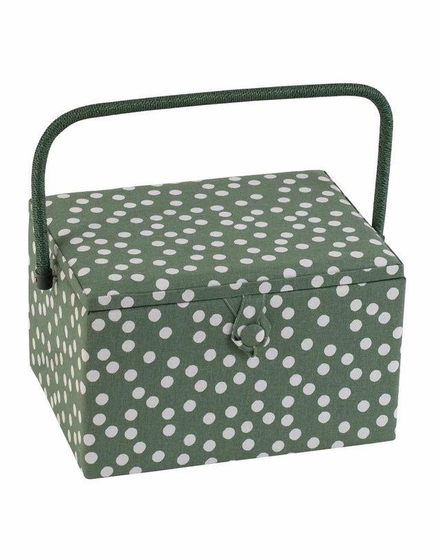 Large sized sewing box covered in 100% cotton fabric with a khaki green and cream spot. Read more