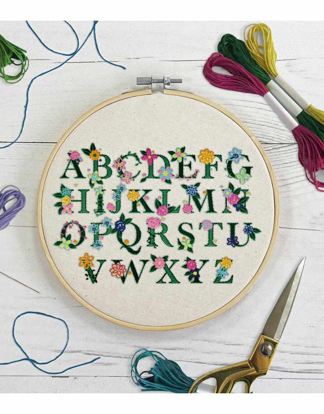 Full of vintage charm this kit comes with everything you need to sample a variety of embroidery stitches and create an alphabet blooming with colour.