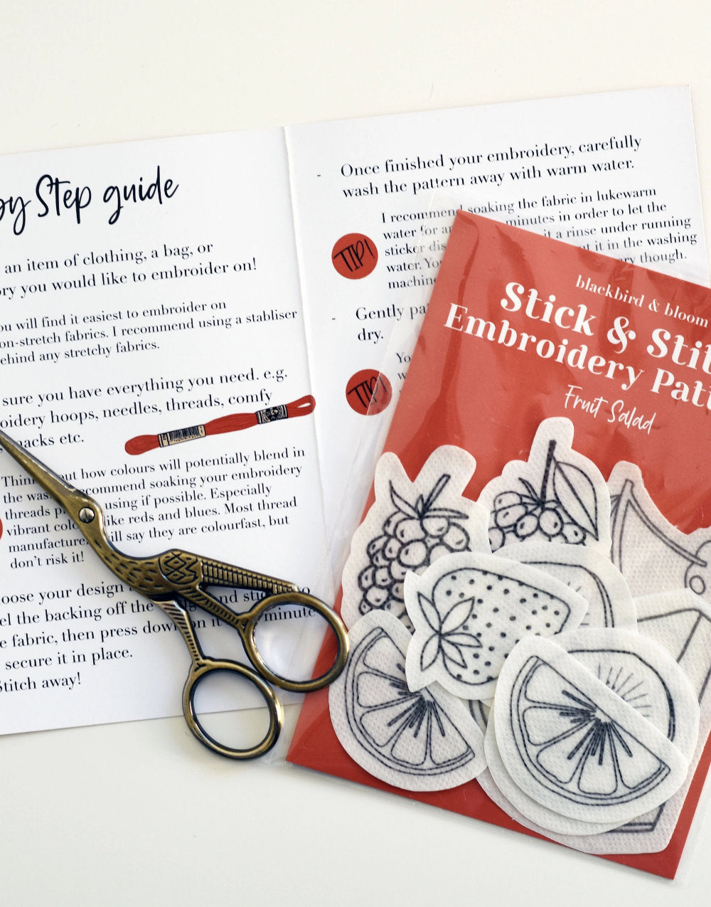 Fruit Salad Stick & Stitch Embroidery Patterns, Blackbird & Bloom
