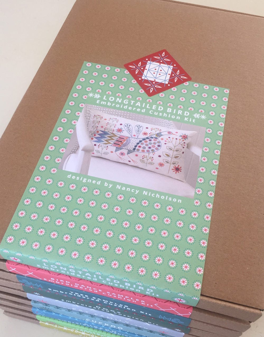 The Longtail Bird Embroidery kit is larger and more elaborate than Nancy's regular stitch kits. It can be used as a standalone sampler but was designed to be particularly suitable as a panel on a cushion cover.