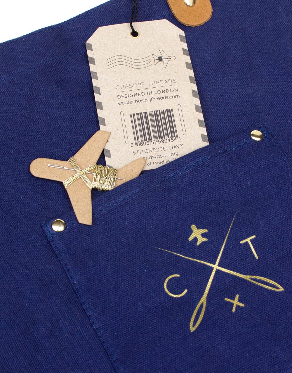 The Navy and Black Tote Bag come with gold metallic thread and the Natural Tote Bag with emerald thread. Each is on a cute aeroplane thread board with 1 needle, and a swing tag with a kit description (so it is perfect for gifting!).