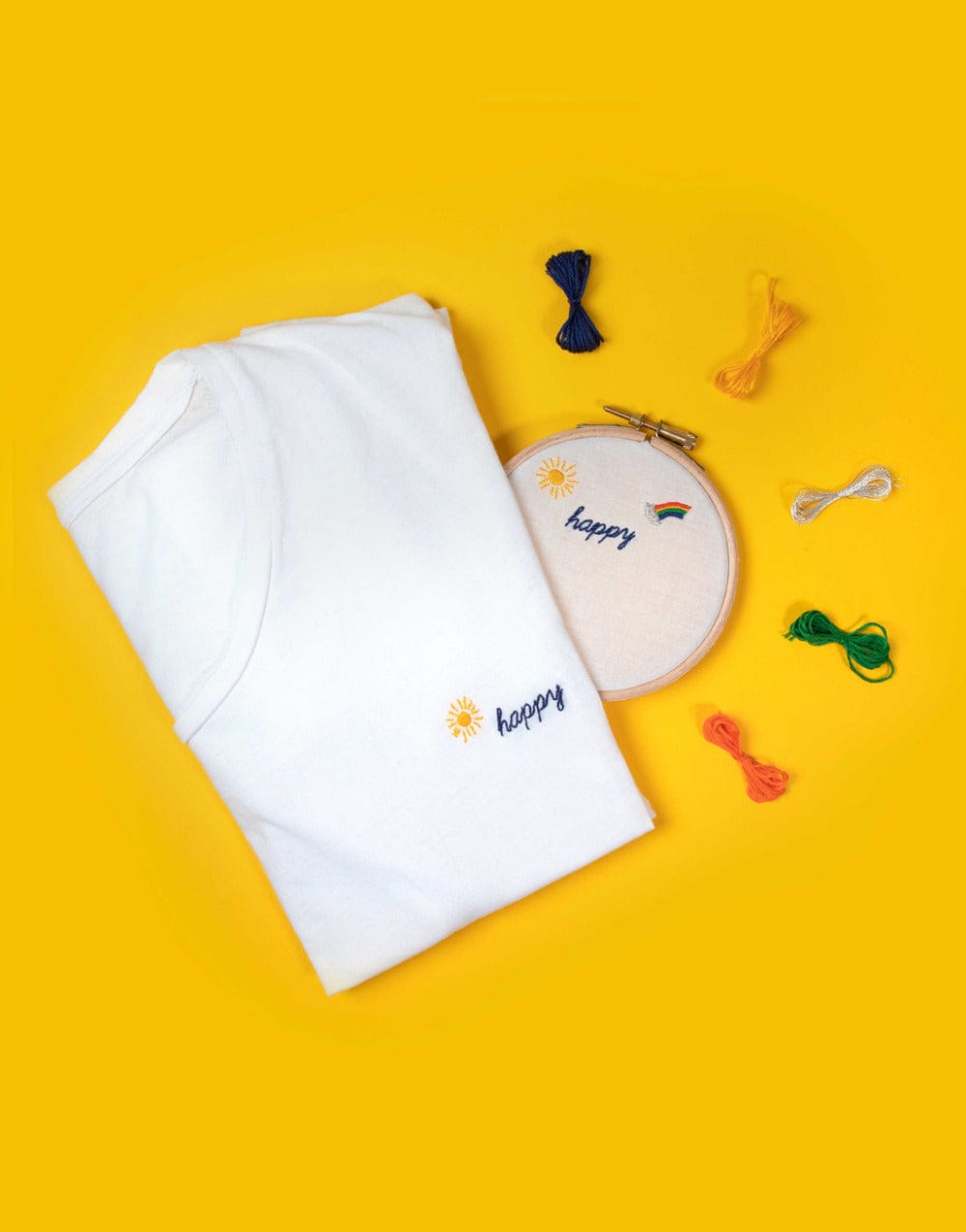 The 'Happy' Easy Embroidery kit allows you to embroider original designs onto any textile garment, object or accessory you like ie. a T-shirt, a sweatshirt, shirts, towels, pillowcases, tote bags, etc. You can customize whatever you want, and discover the fun of embroidery!