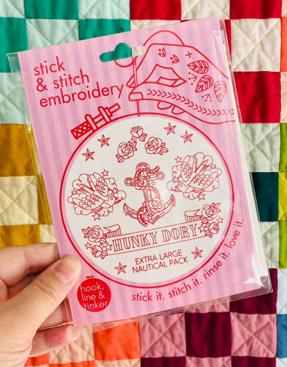 Looking to update or personalize your wardrobe or home textiles with a bit of WOW? Then try Hook, Line & Tinker's latest Stick & Stitch designs to create one-of-a-kind fabulousness! Inspired by sailor tattoos this kit features anchors, sparrows, the hunky dory banner, stars, and roses.