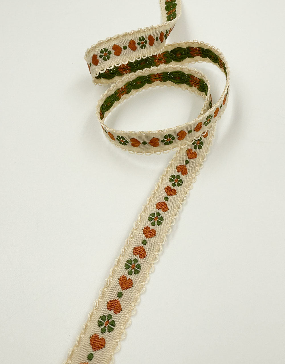 A charming jacquard trim featuring a delicate row of little hearts and floral motifs in soft vintage colours. Made from 100% polyester, it’s smooth, durable, and easy to sew, perfect for adding a decorative edge to clothing, bags, festive crafts, or home décor projects.
