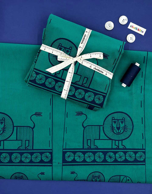 Unisex Smiley Lion dungarees kit based on a vintage Clothkits pattern. Screenprinted on a gorgeous emerald green corduroy, the Smiley Lion was exclusively created for Clothkits by Jane Foster.