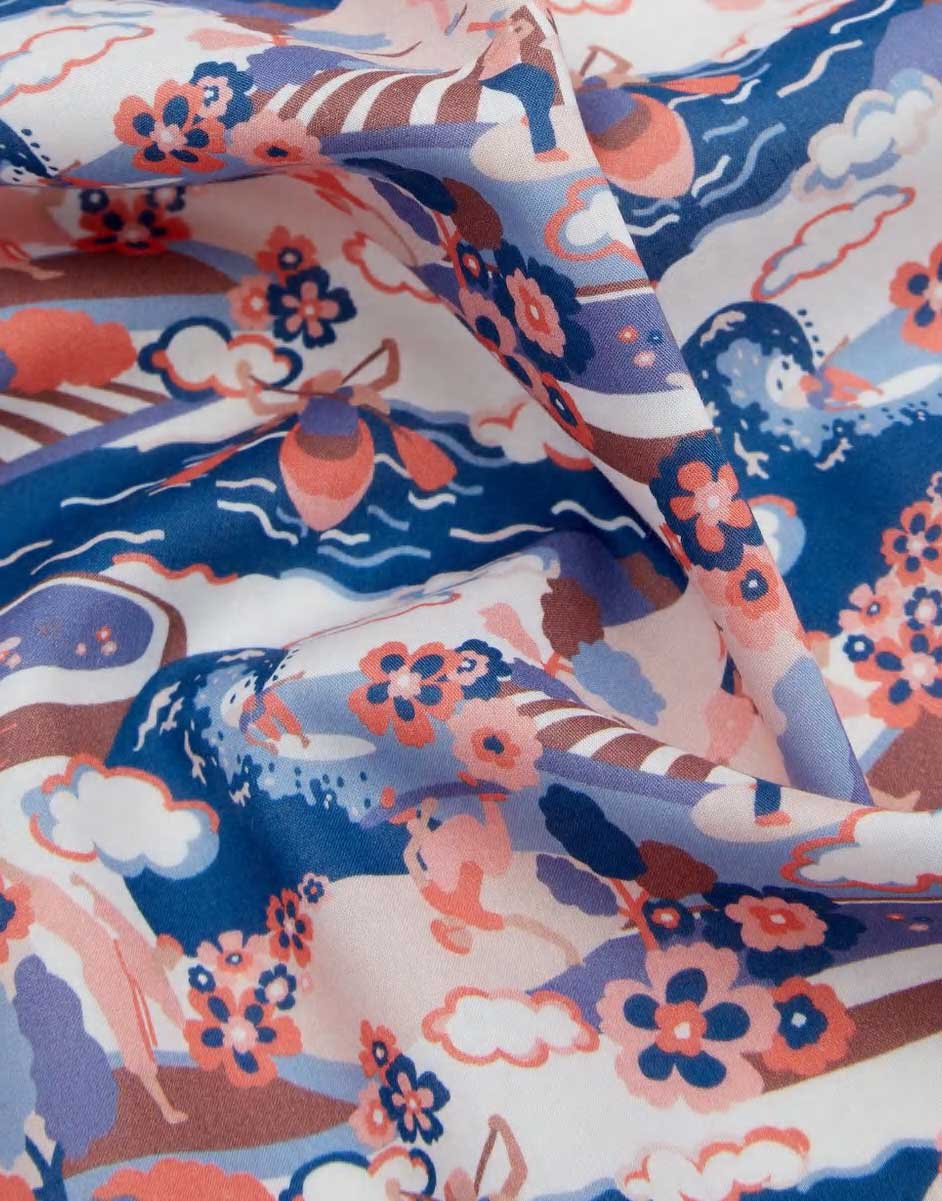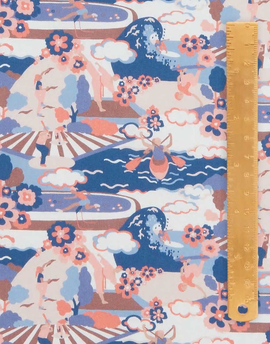 This fun scenic design leads you energetically across the fabric from one sport to another. Painted in gouache in the Liberty studio, it features the five debut sports introduced to the Tokyo Olympics; Baseball, Sport climbing, Skateboarding, Surfing and Karate.