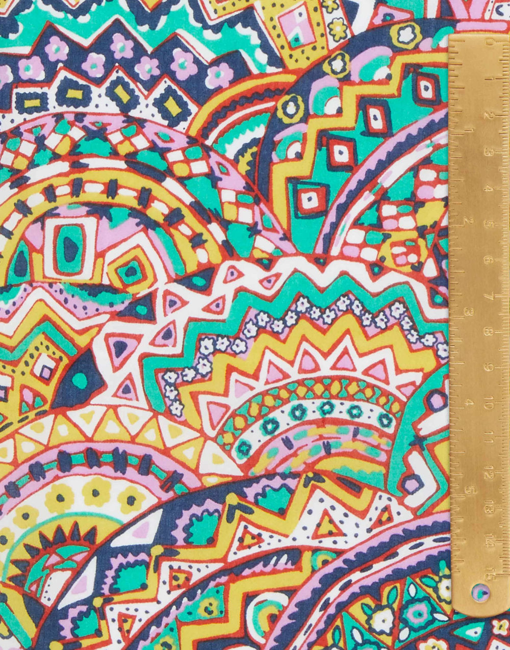 Based on a Liberty design from the early 1980s, Newton has been reworked into a vibrant abstract geometric. Its hand-painted semicircles of flowers, chevrons and stripes overlap one another to form a celestial kaleidoscope, suggestive of imaginary rainbow realms.