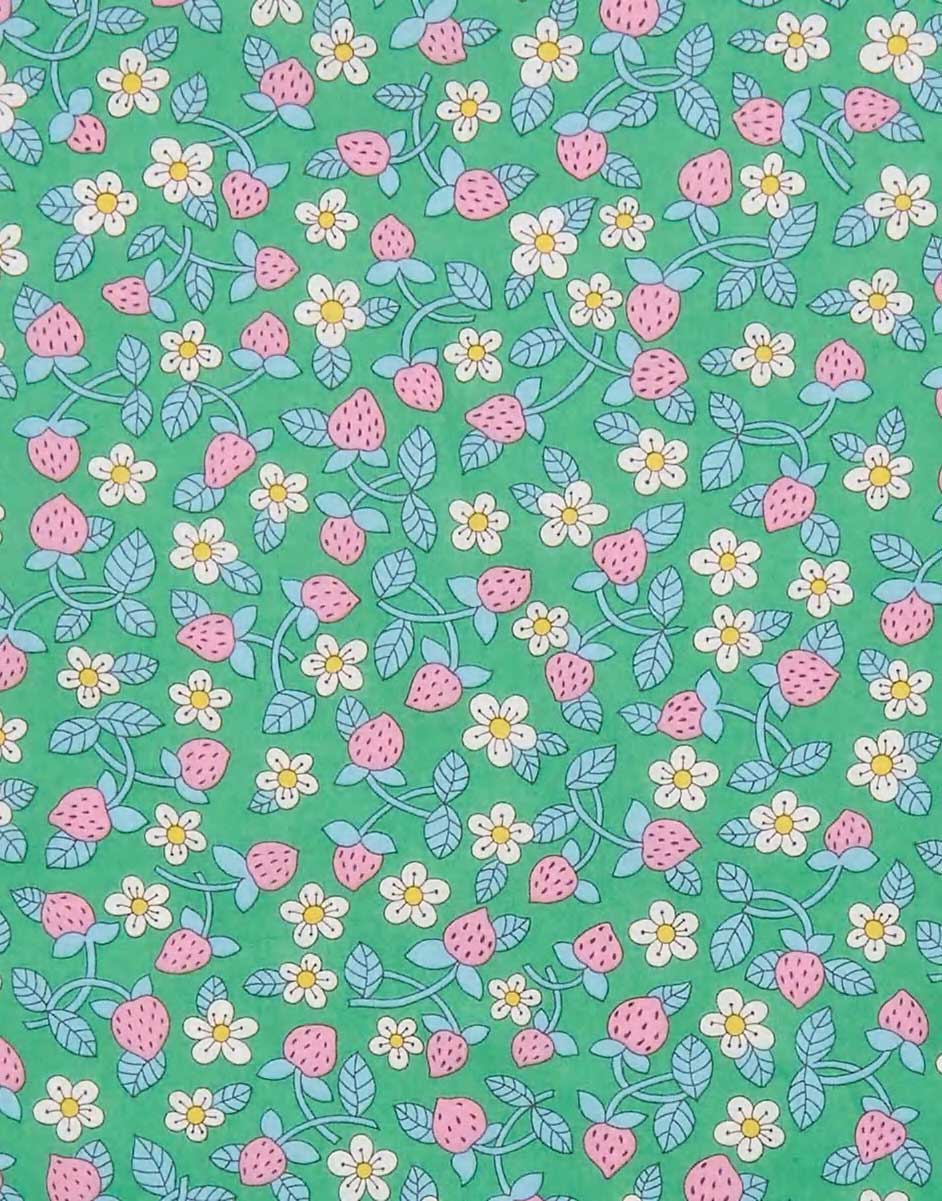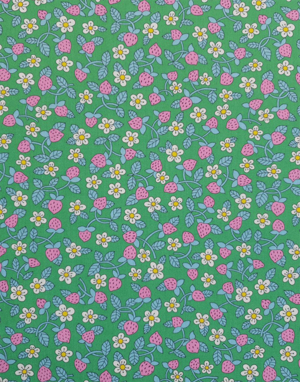 Inspired by a Liberty print dating from 1965, this sweet pattern conjures the laziness of warm sunny days. Small delicate strawberries and their flowers are arranged in a trailing repeat, coloured in fresh contrasting hues.
