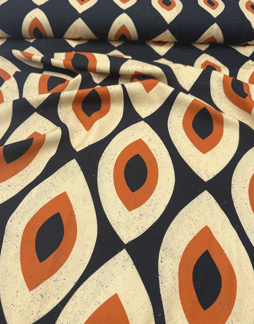 A bold and beautifully rhythmic print, this viscose features a stylised “eye” motif in warm cognac and soft cream, set against a deep charcoal black ground. The shapes have a hand-printed, slightly textured look, giving the design a touch of vintage charm.